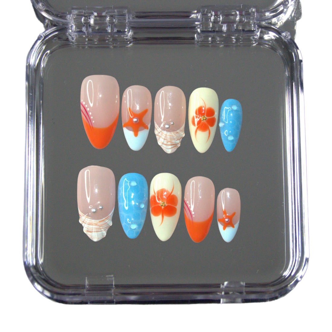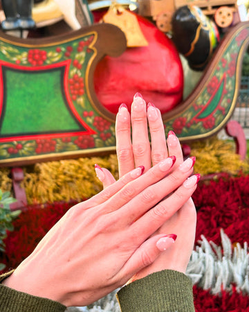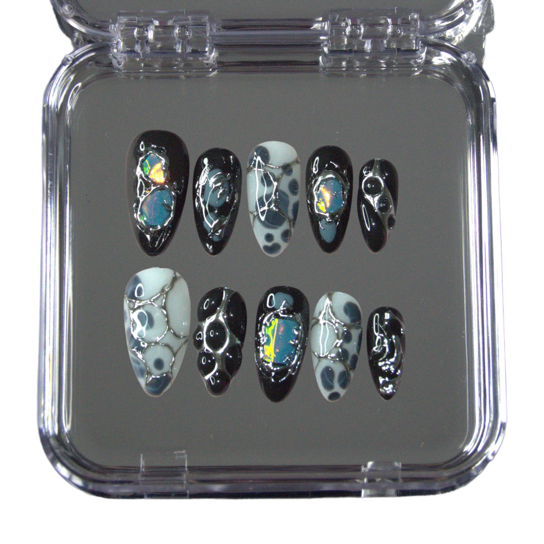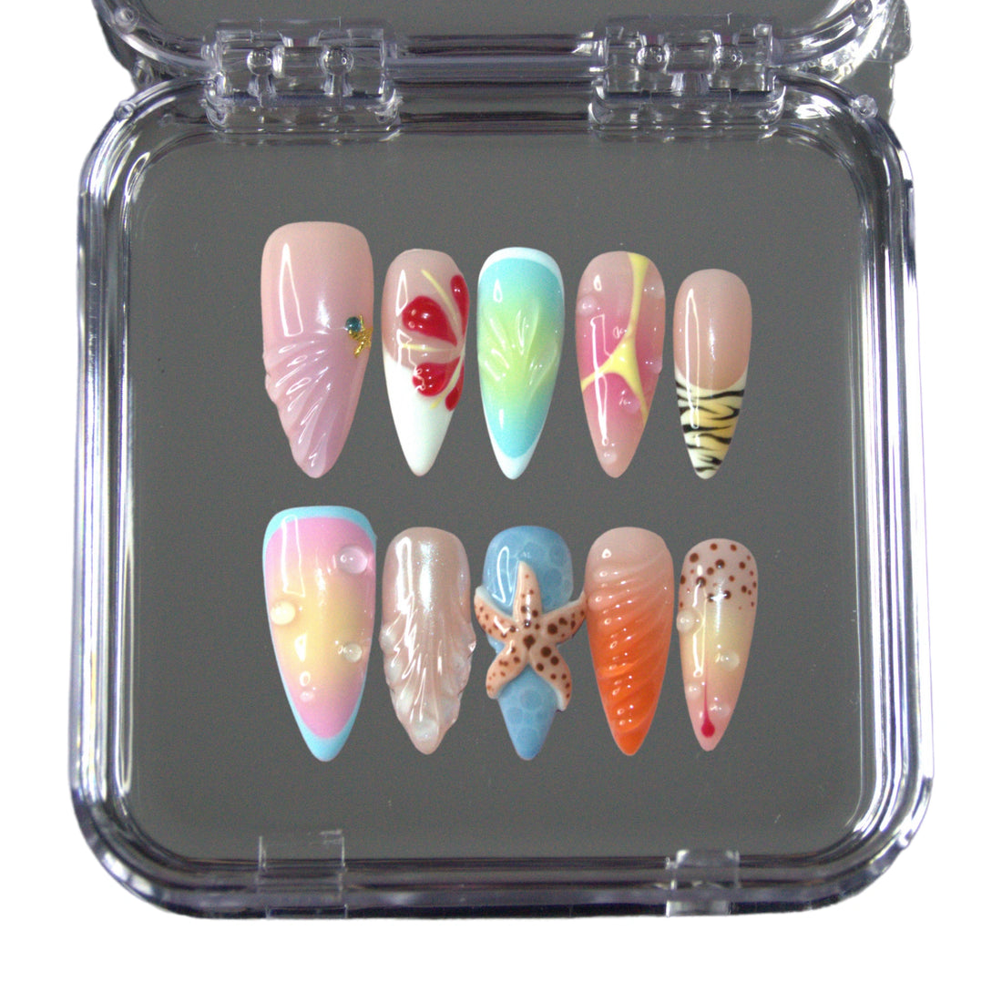 Handmade models, like Mimi's, are stronger, thicker, and offer unique and intricate finishes. Industrial press-ons are often more fragile and less detailed. To recognize them, machine-made press-on nails often have a piece of plastic at the end of the nail that must be filed.