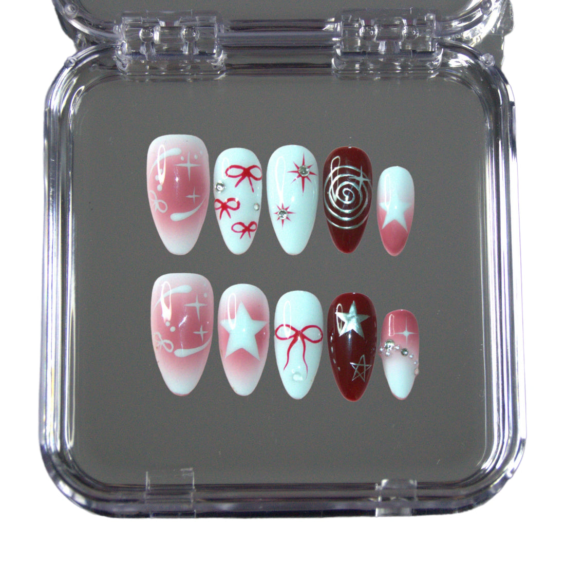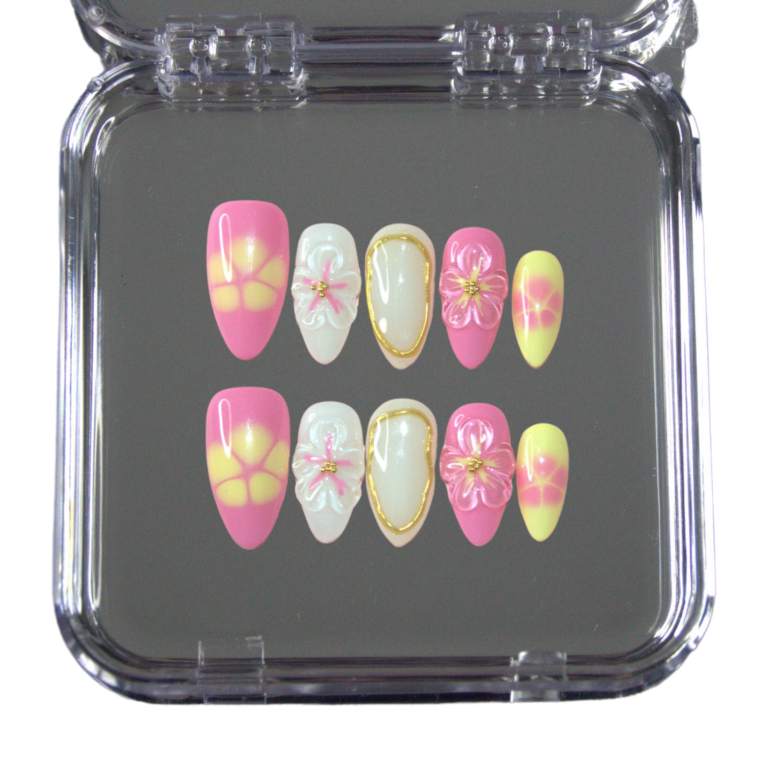 Press-on nails are reusable false nails that stick directly onto your natural nails. They offer salon-quality results without damaging your nails and are quick to apply (in just a few minutes).
