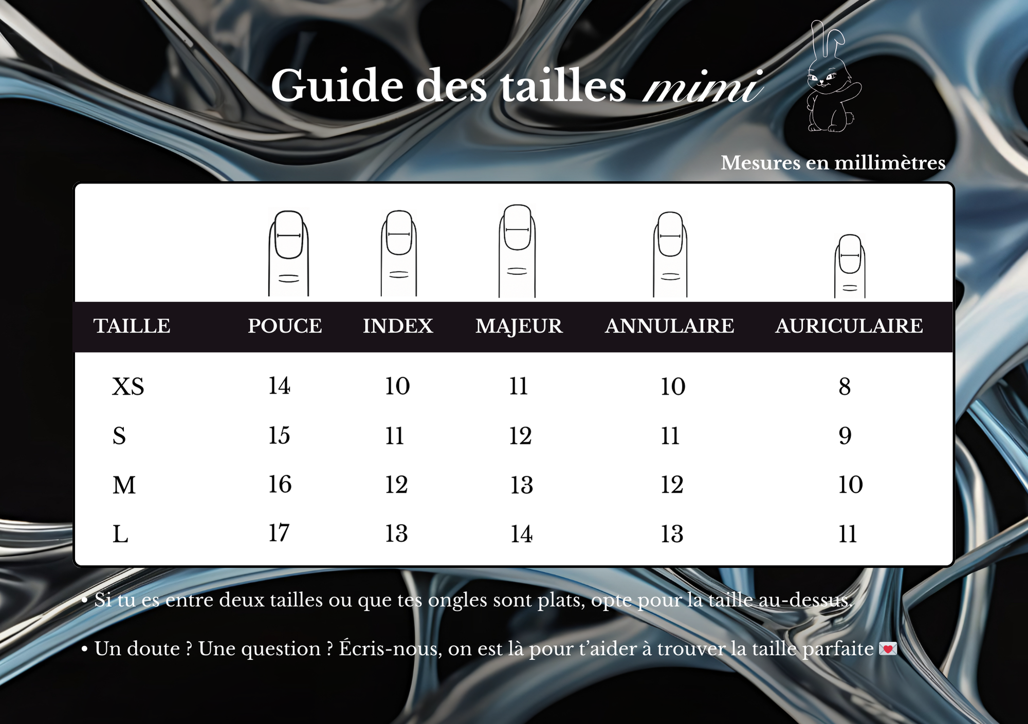 Please note that the size charts refer to MiMi brand nails and are designed to fit the following finger measurements.