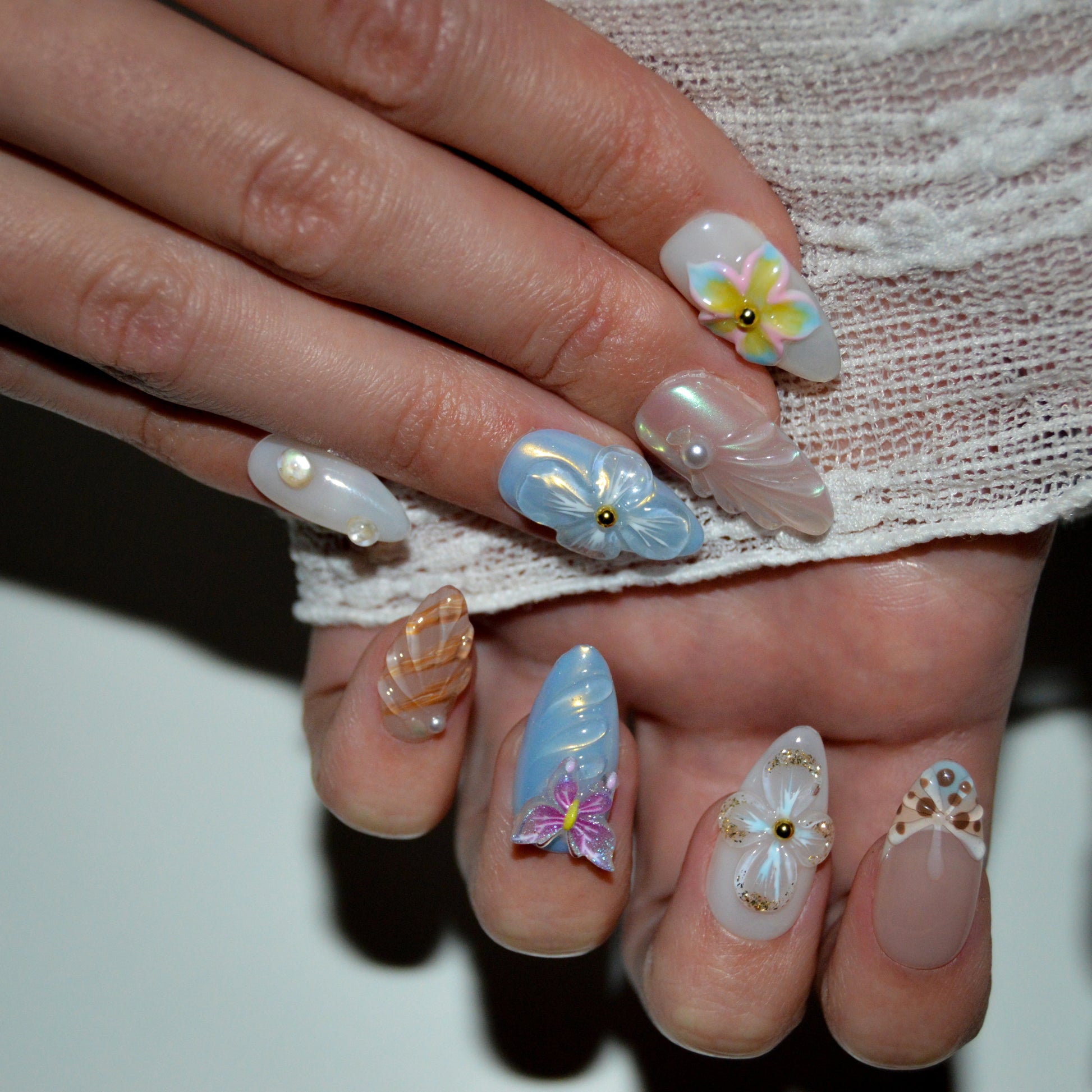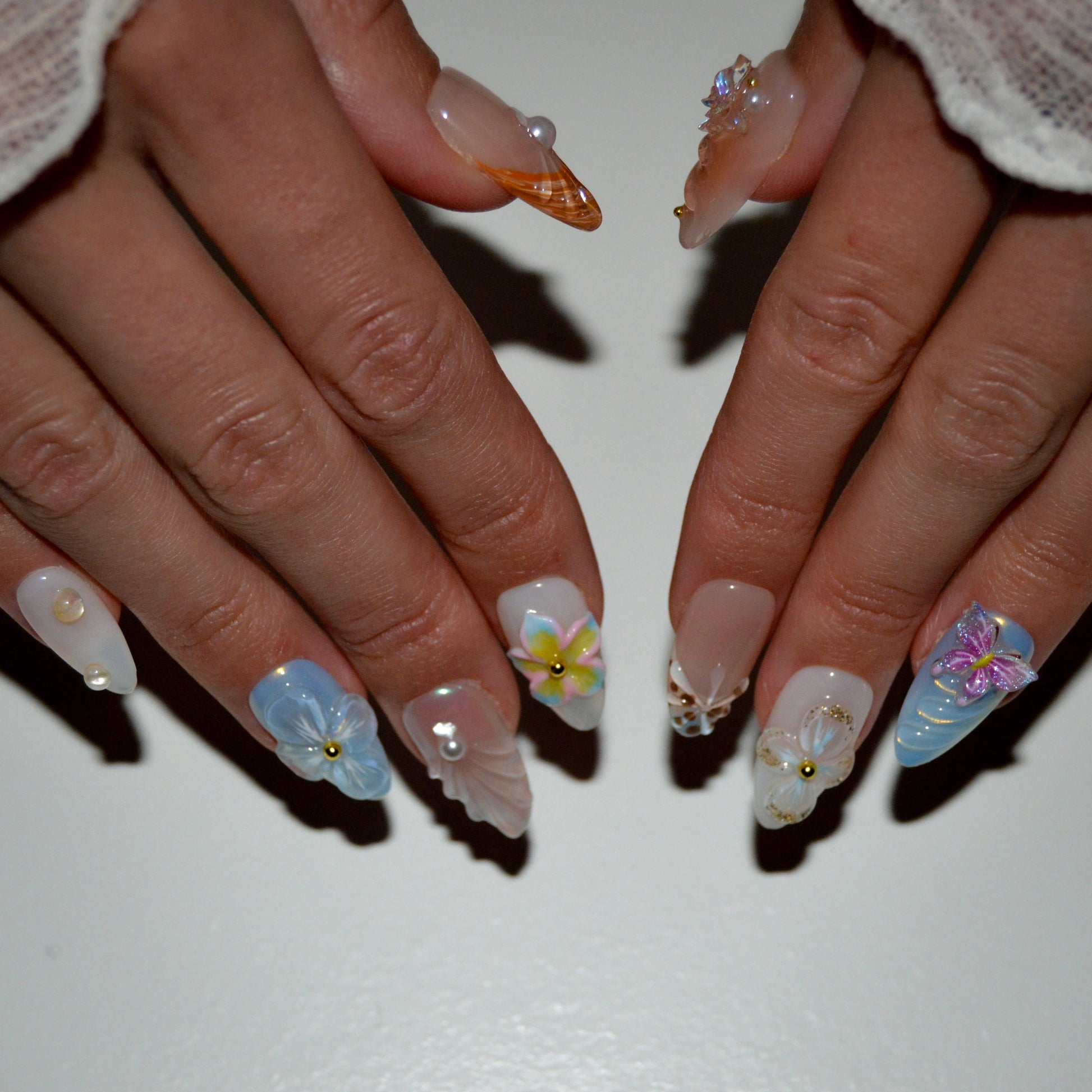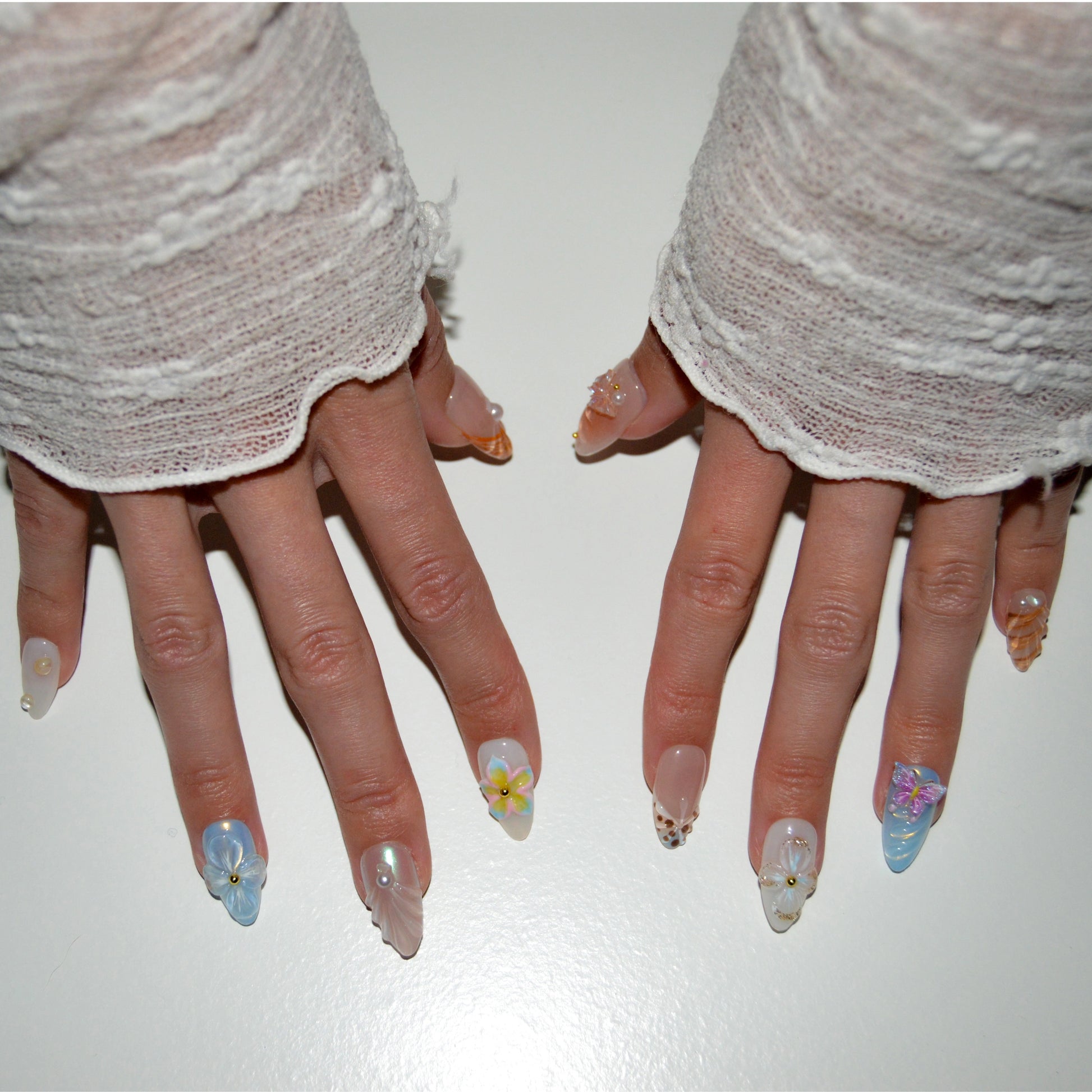 Handmade press-on false nails in pink, nude, and blue, decorated with 3D shells, flowers, and butterflies. A summer and beach-inspired design that adds a bright and original touch to your manicure.