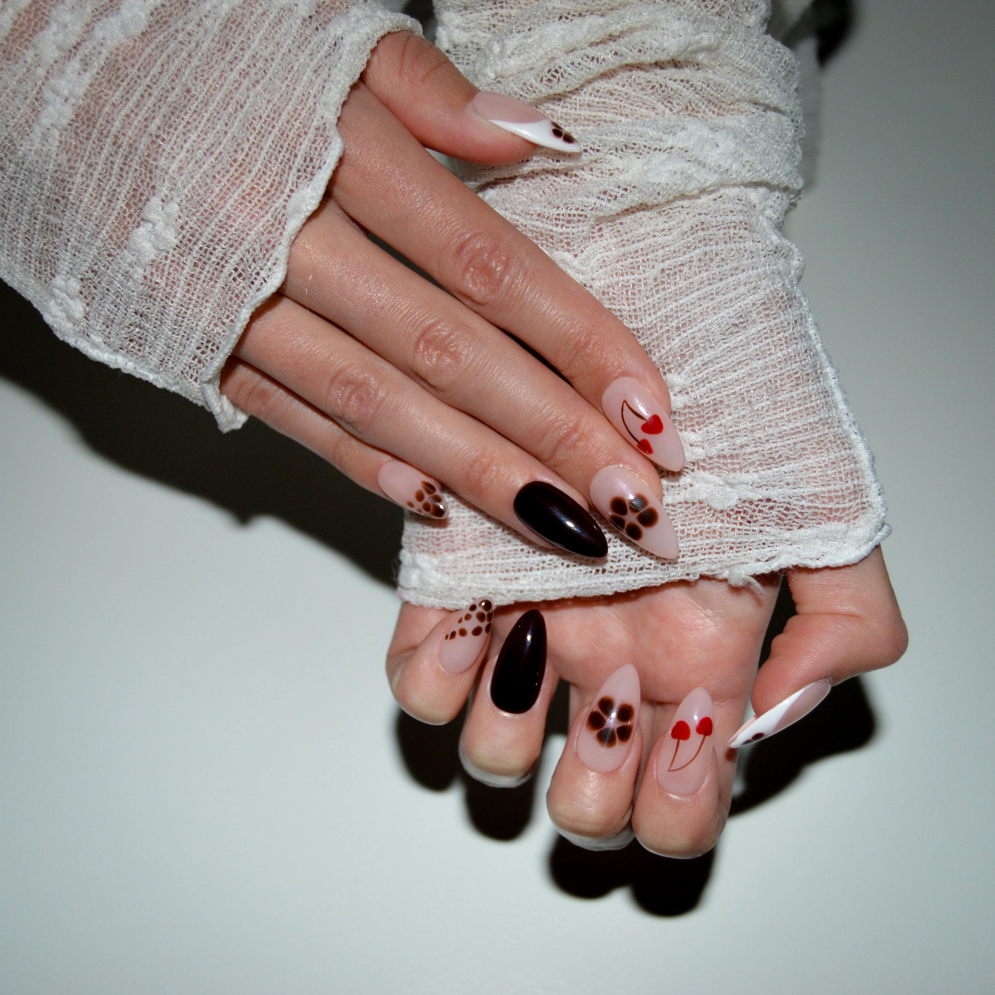 Handmade press-on false nails in nude and brown, decorated with floral patterns and red cherries. An original and contrasting design that combines softness and boldness for a unique manicure.