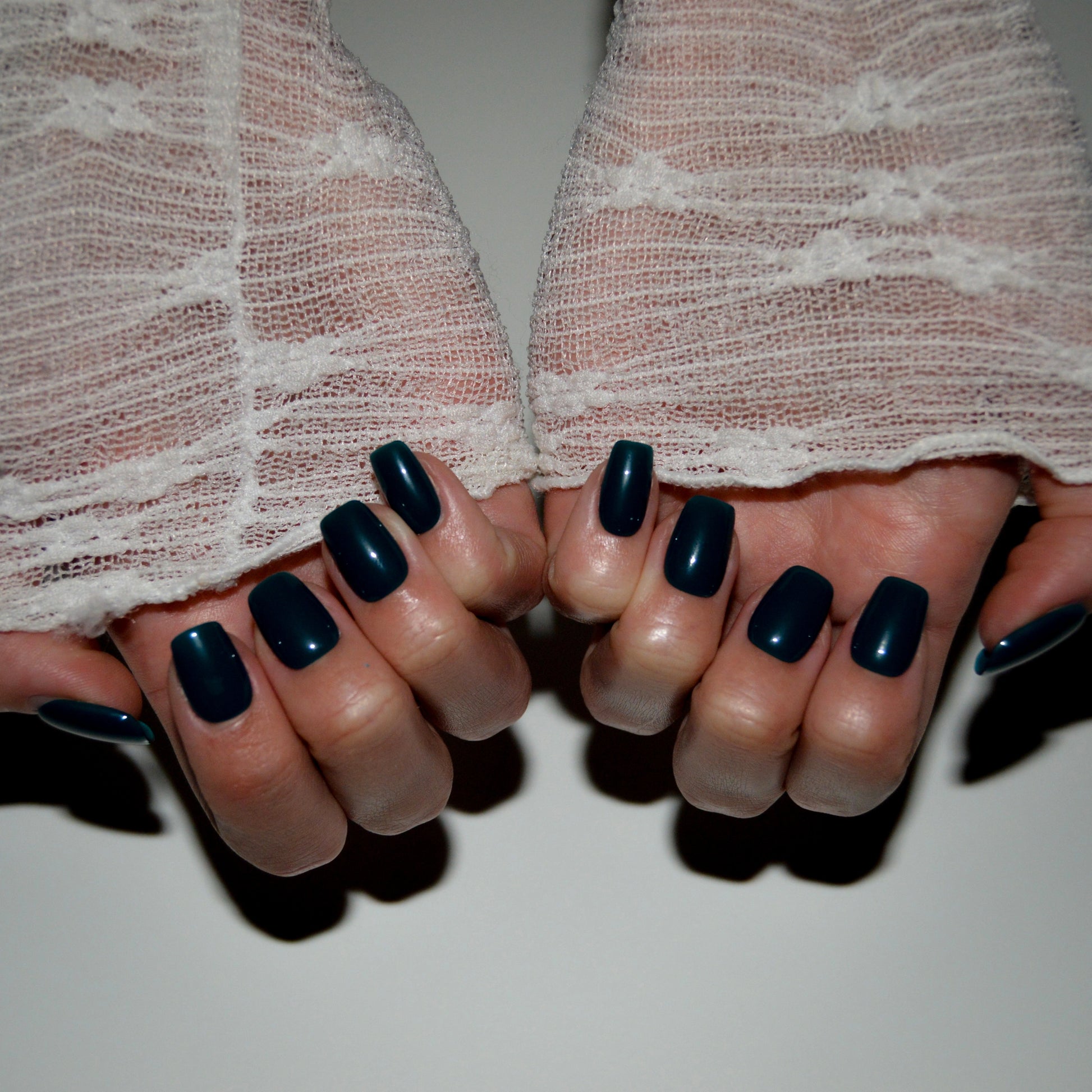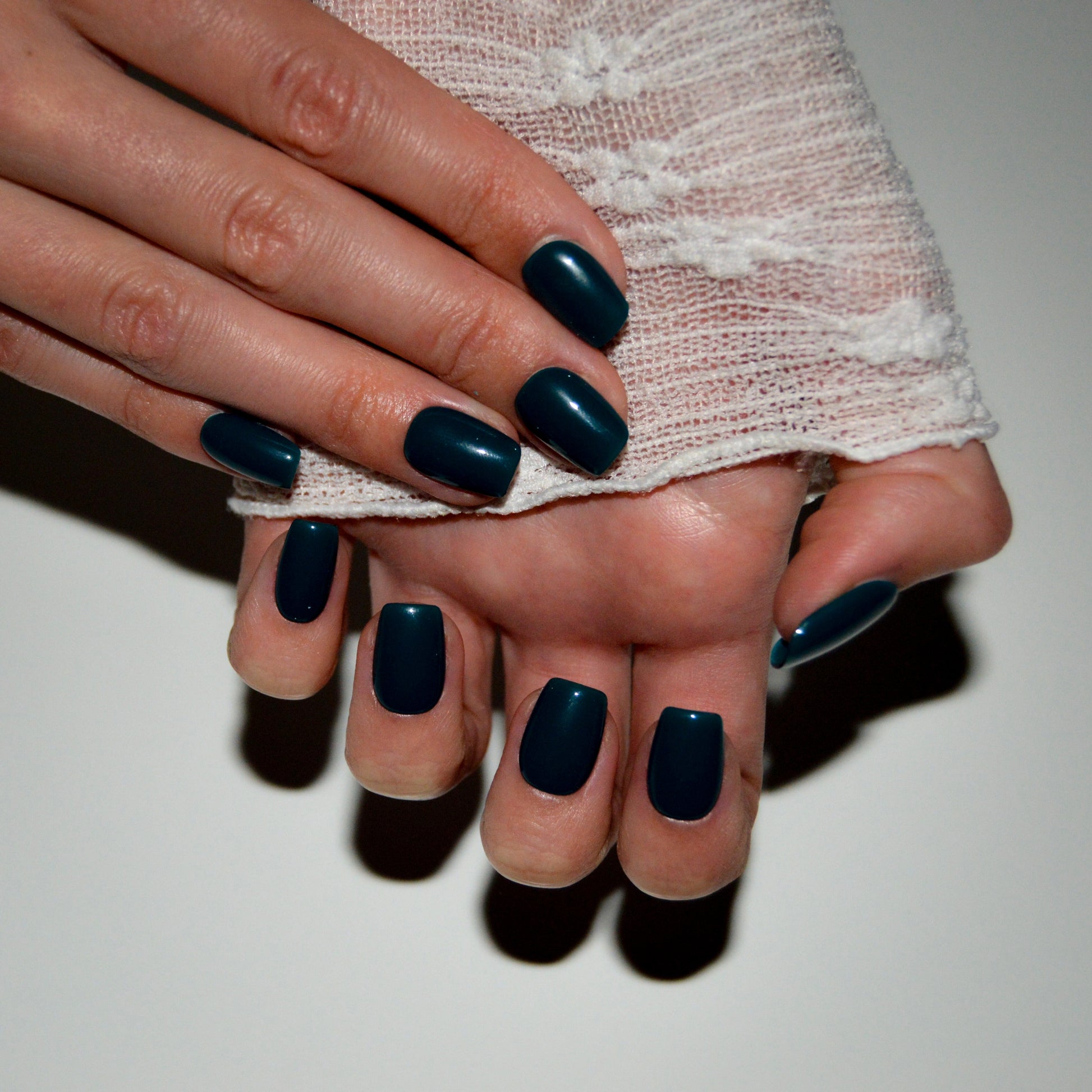 Handmade press-on false nails in deep midnight blue. Their glossy, intense finish adds a sophisticated and elegant touch, ideal for a statement manicure.