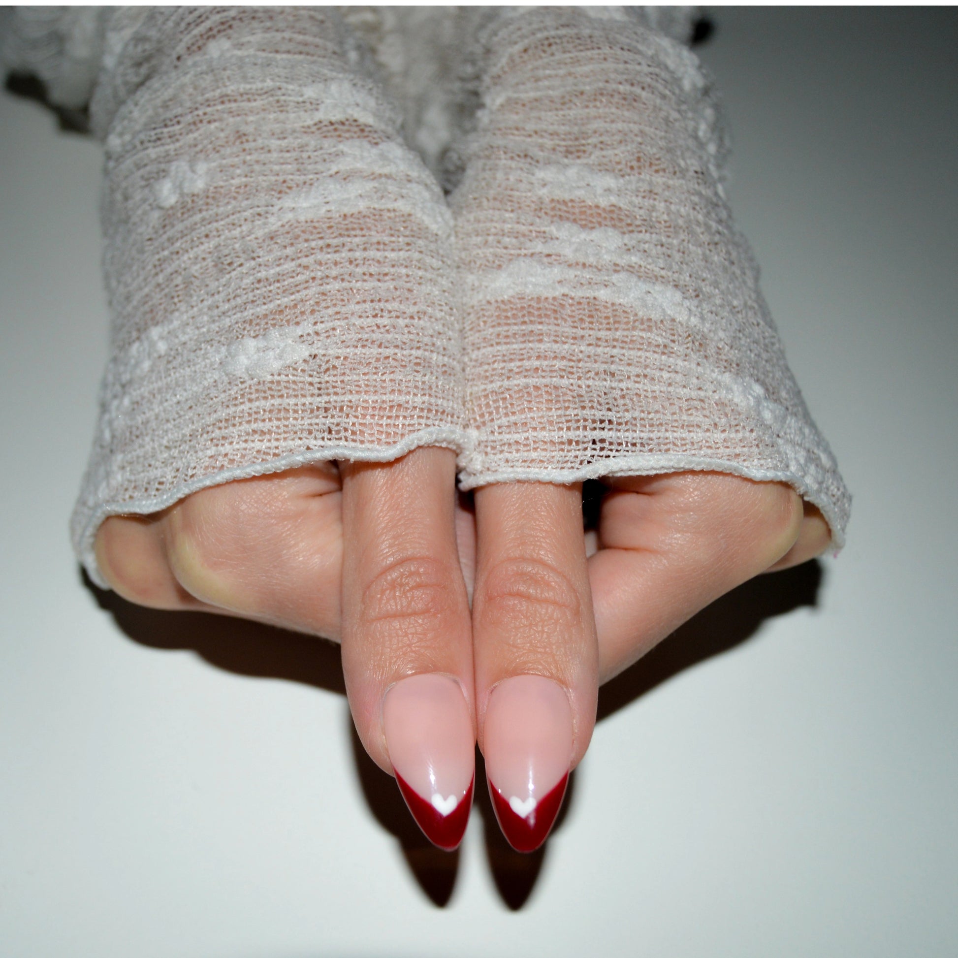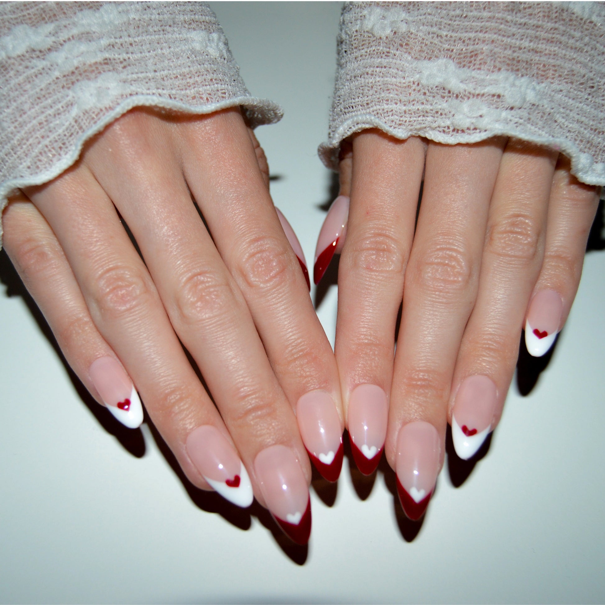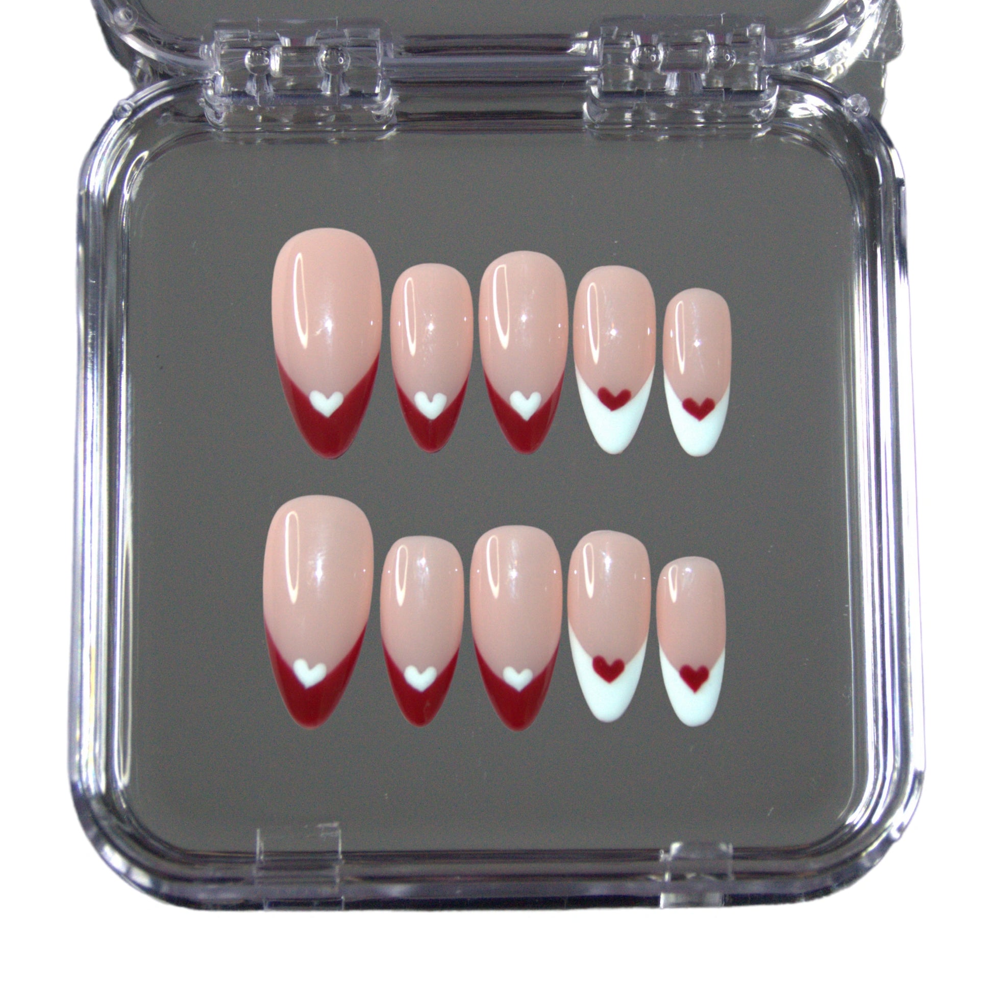 Handmade press-on false nails with a nude base and red or white French tips, decorated with a small heart in the center. An elegant and romantic design that enhances your manicure with simplicity and originality.