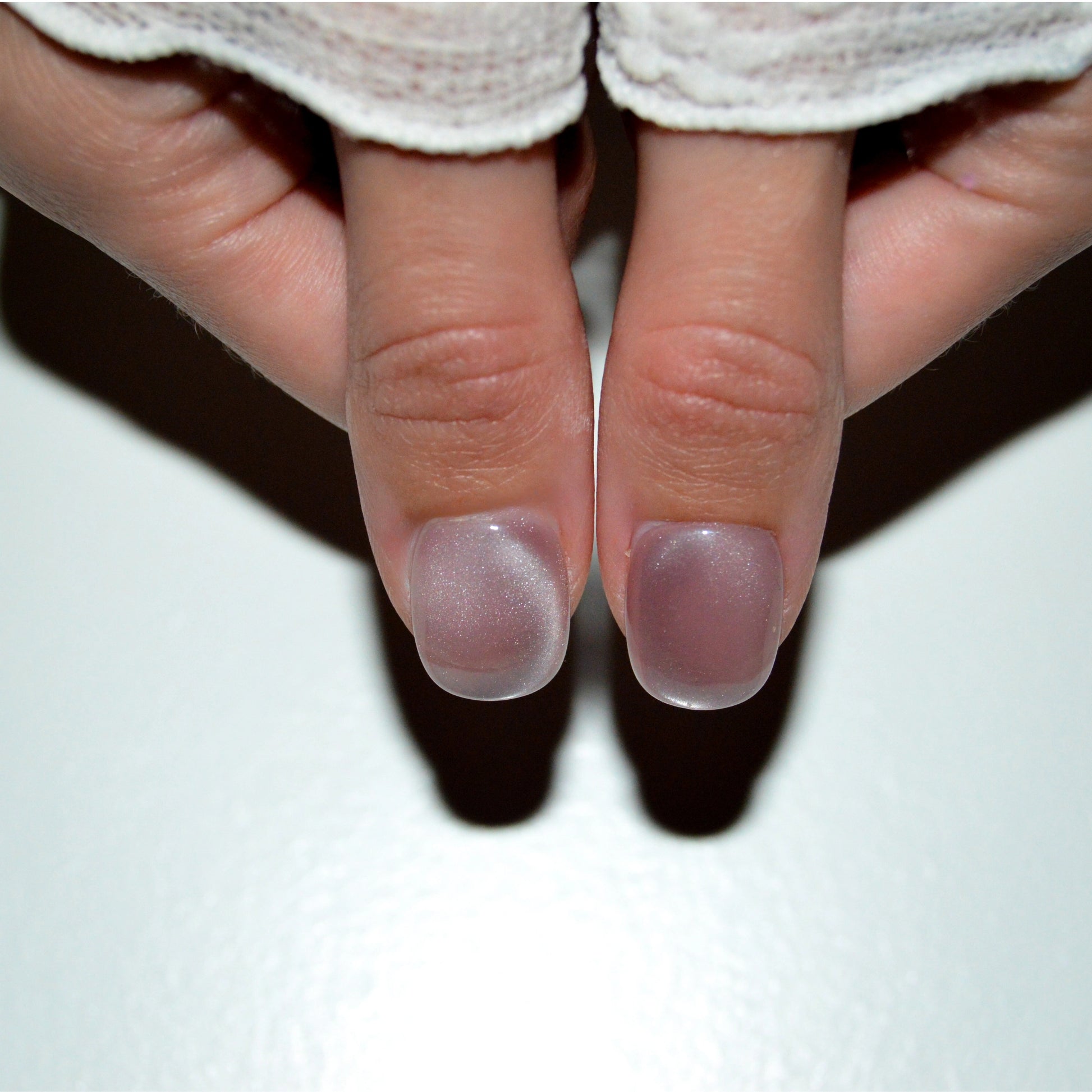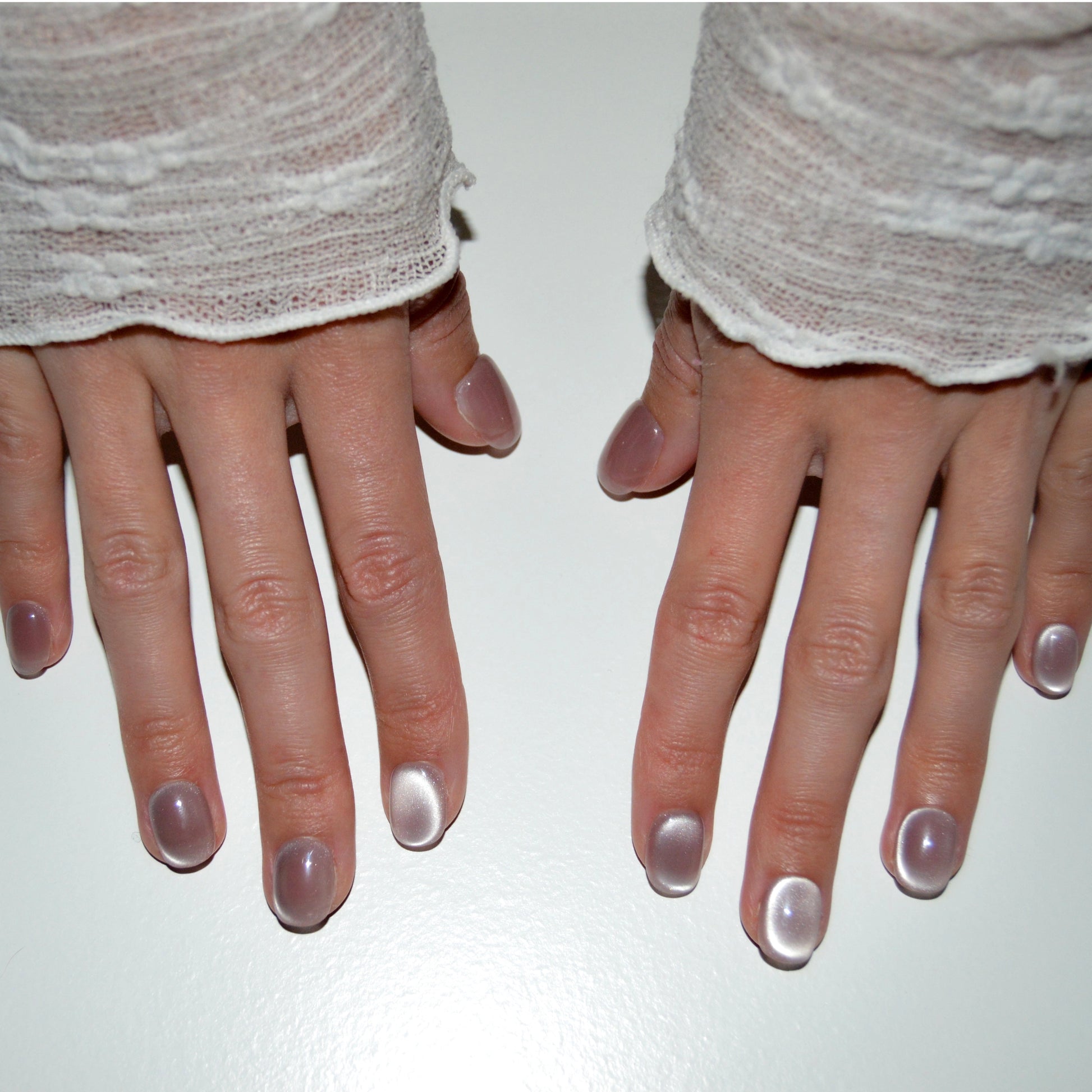 Handmade press-on false nails in a glossy pearlescent pink. Their luminous finish reflects the light for a chic and sophisticated effect, perfect for a simple, elegant manicure.