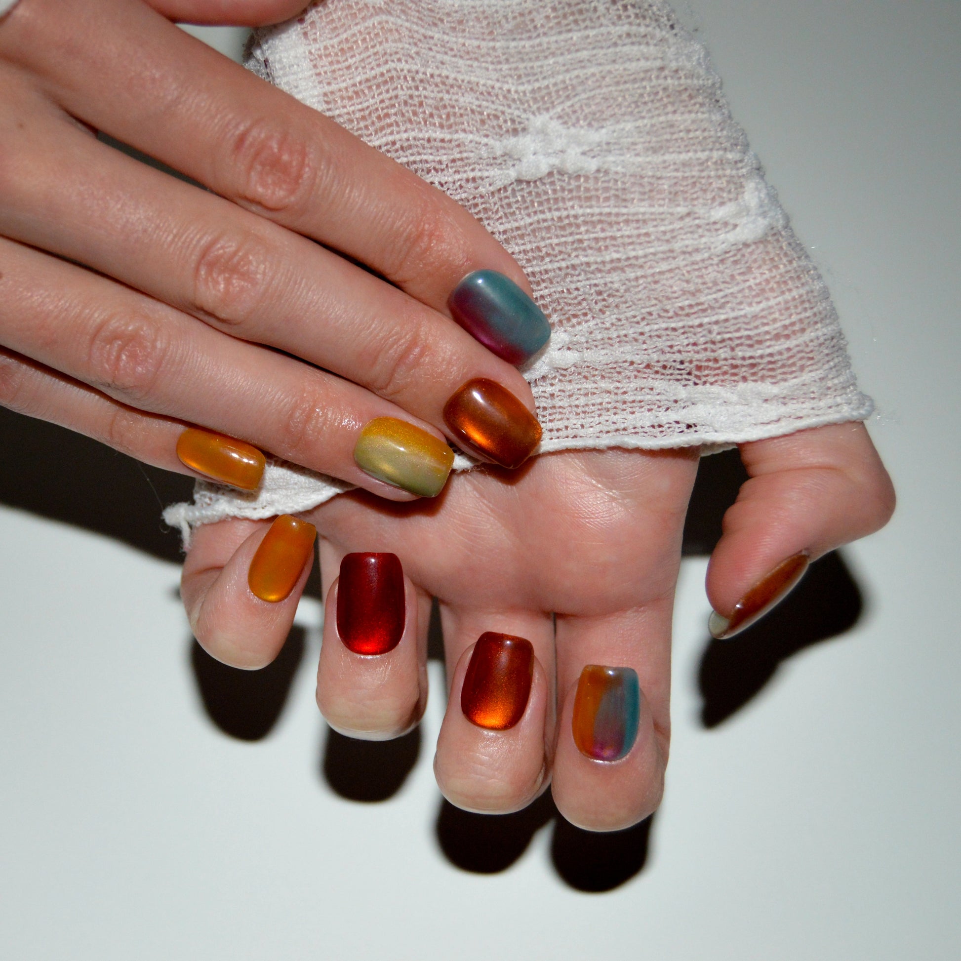 Handmade multi-colored press-on false nails. Gradients of pink, green, yellow, and blue for a bright and unique effect.
