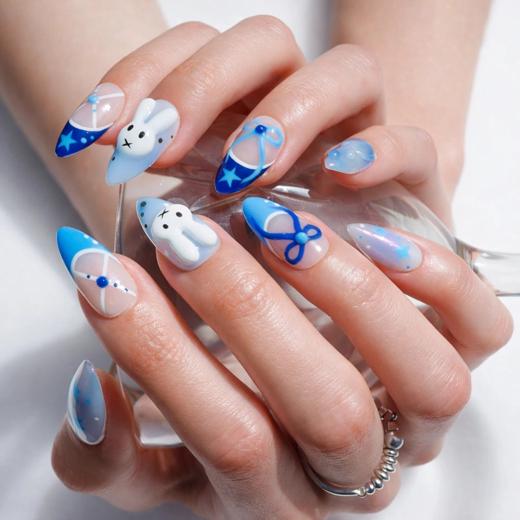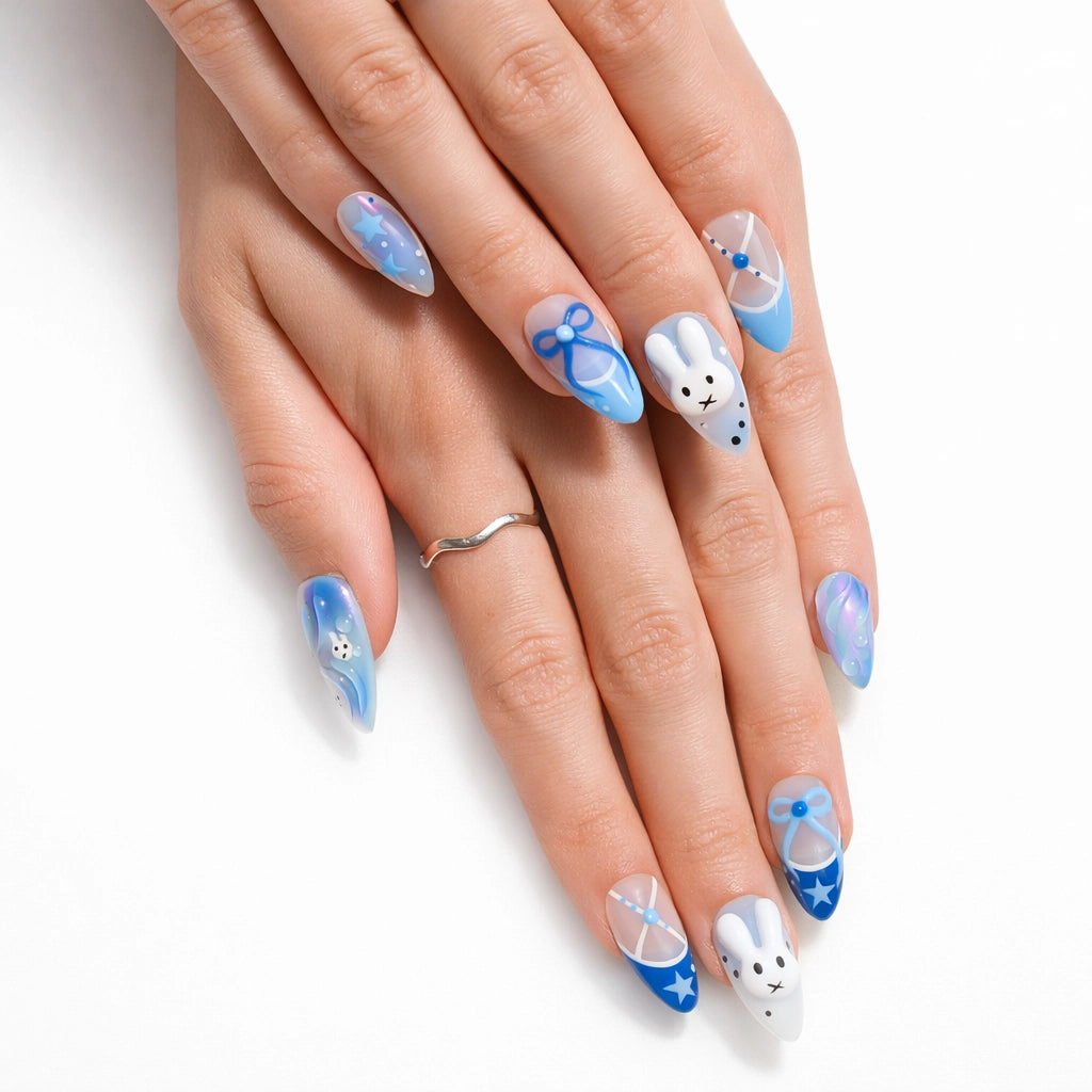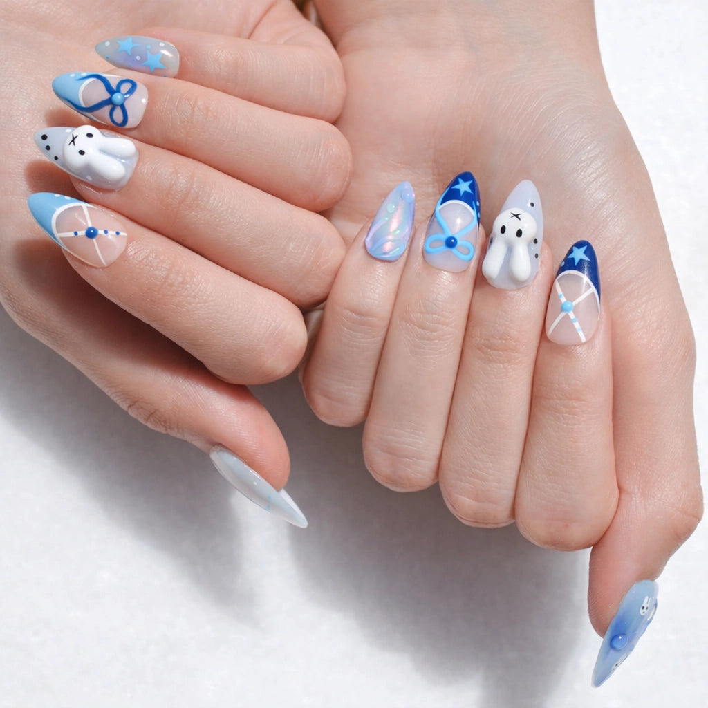 The Sweet Bunny set features delicate 3D effects in nude, blue and white shades.