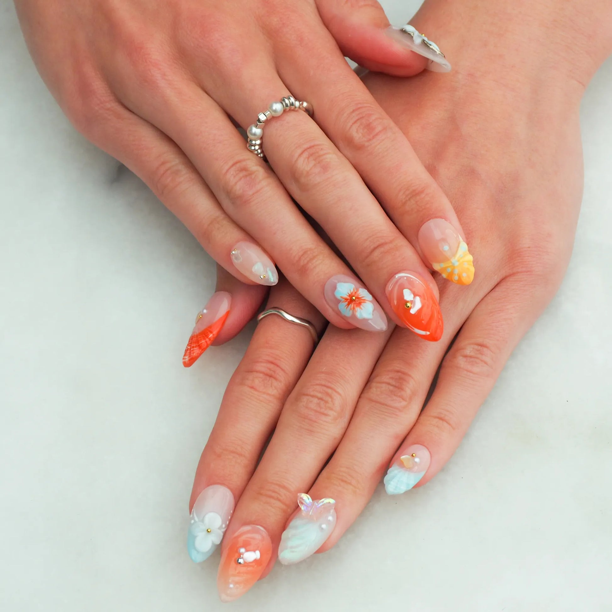 Faux ongles press-on faits main aux nuances bleu, orange et nude, sublimés de détails floraux et de décorations en relief. Un design qui évoque l’océan et les vacances en bord de mer, pour une manucure éclatante et estivale.