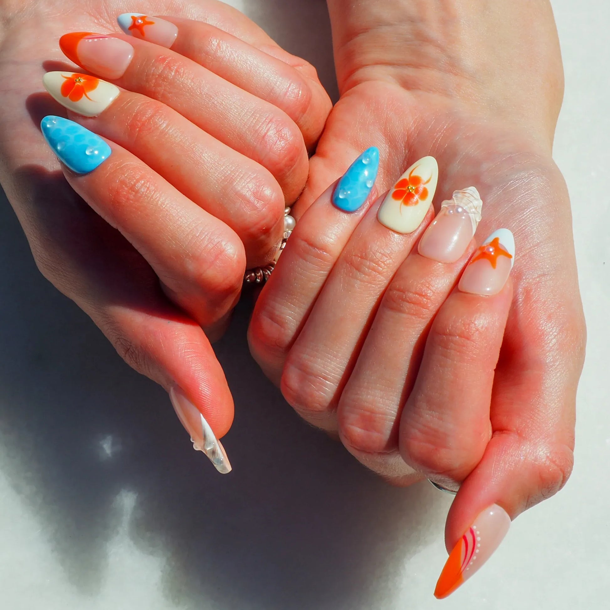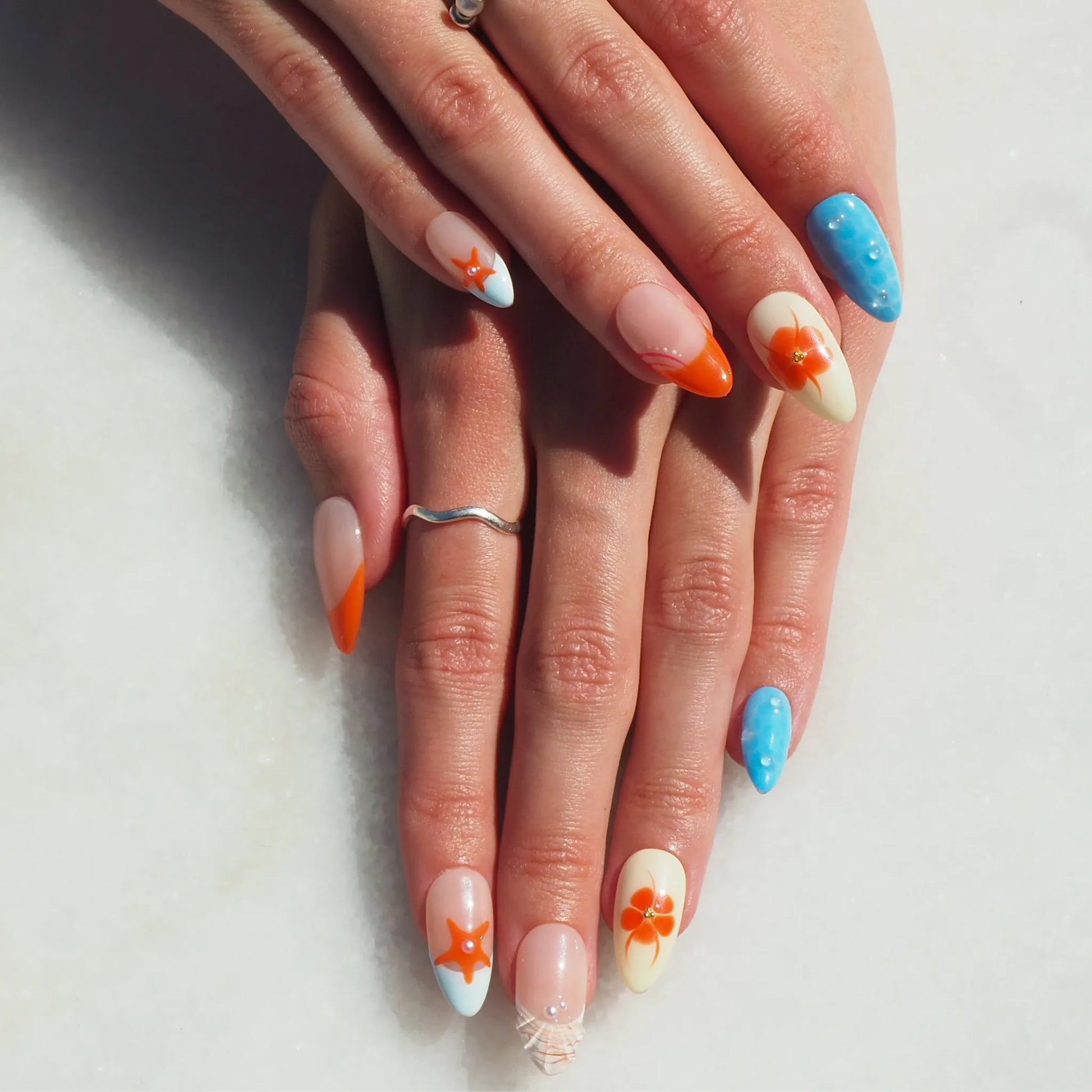 Faux ongles press-on faits main aux tons orange, bleu et nude, décorés de fleurs vives, étoiles de mer et détails perlés. Un design coloré et estival qui évoque la chaleur et la beauté des couchers de soleil tropicaux.