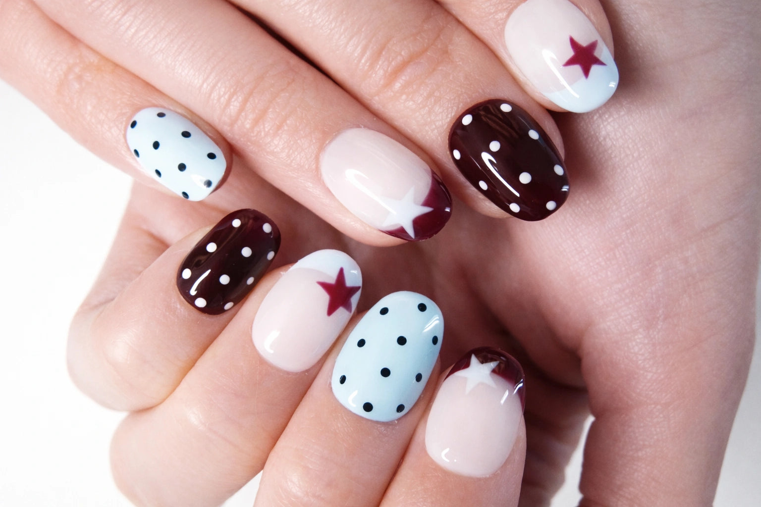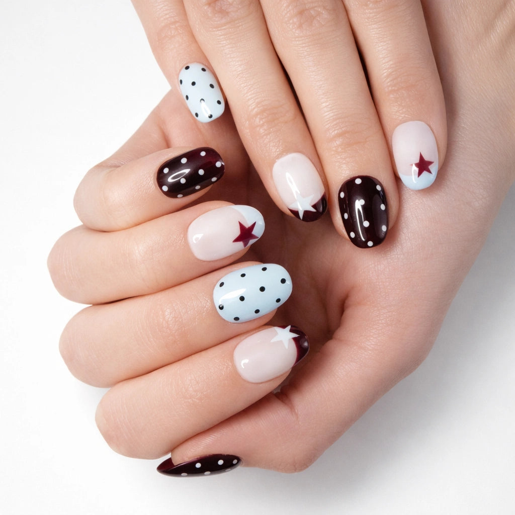 Faux ongles press-on faits main en gel et acrylique. Un design unique, mélangeant polka dot et milky french, un nail art étoilés aux couleurs bleu et bordeaux.