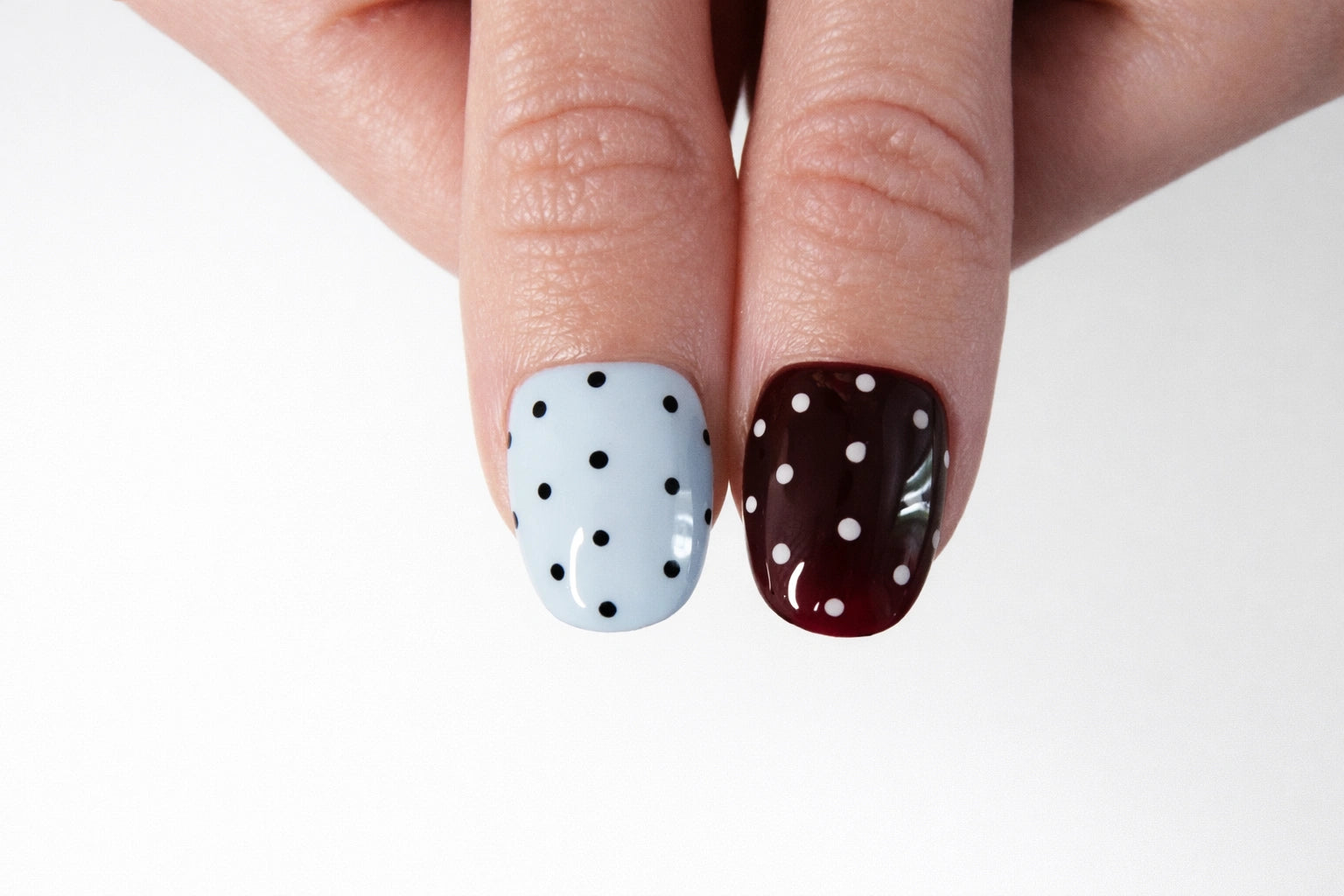 Press on nails nailart bleu et bordeaux polka dots et milky french.