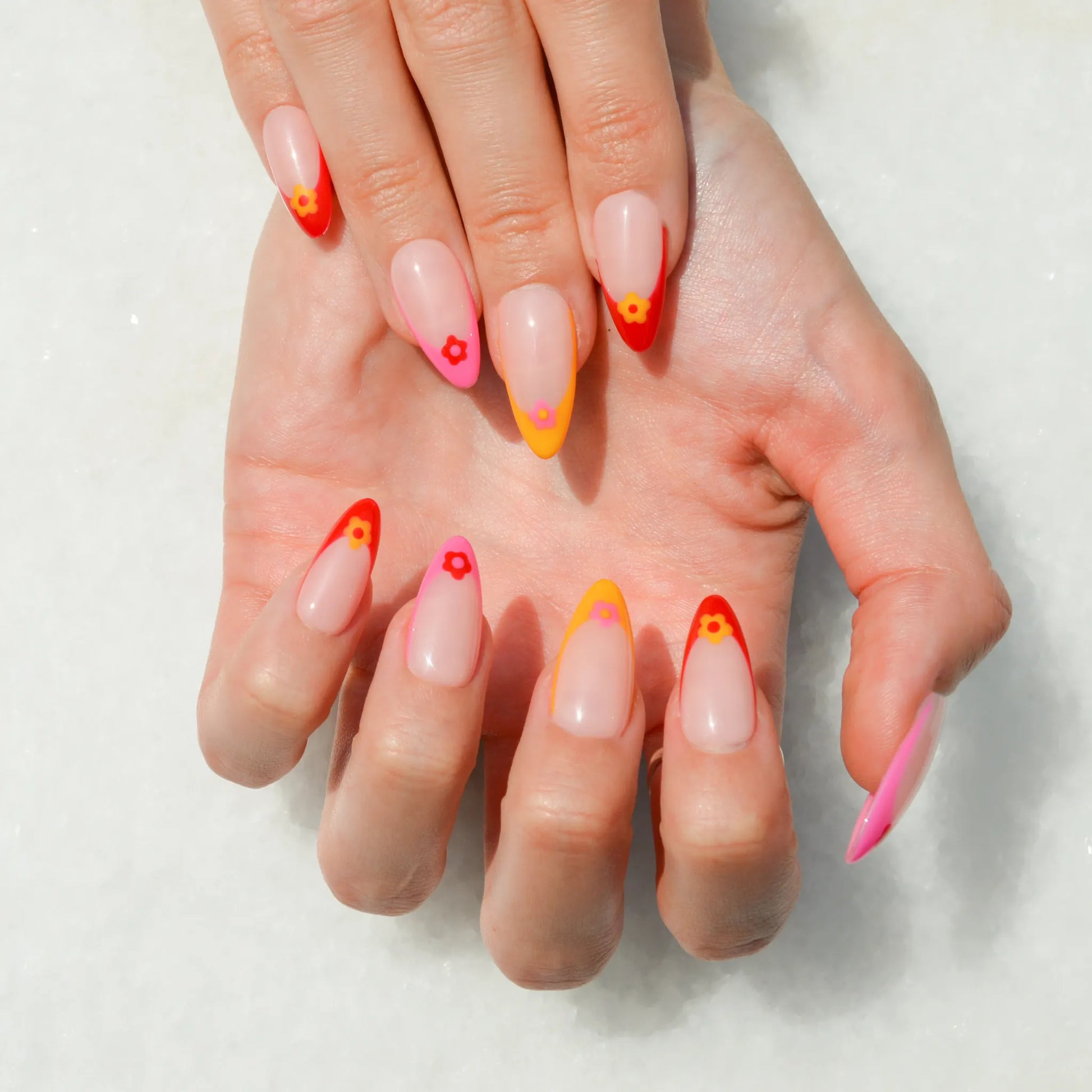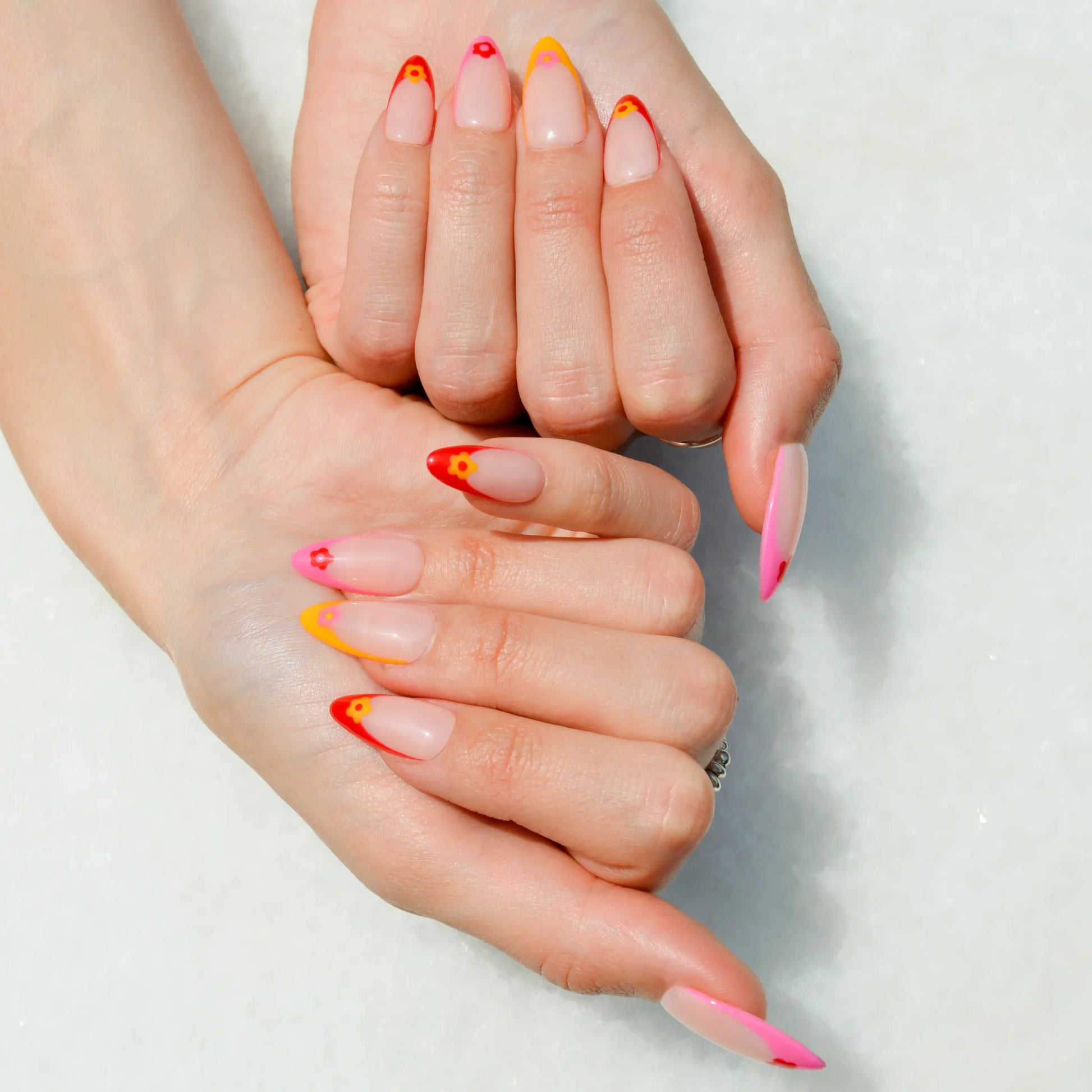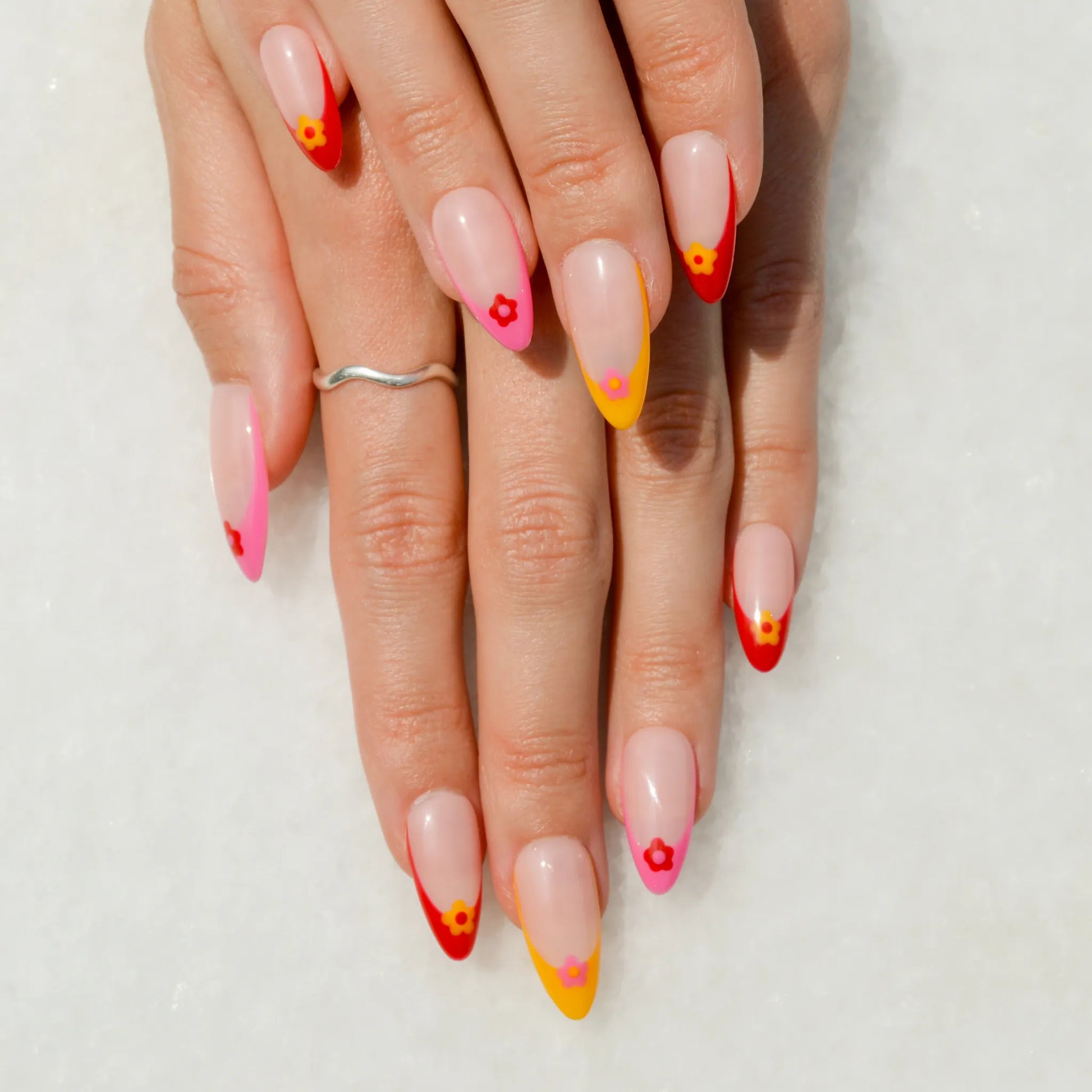Faux ongles press-on faits main avec une base nude et un french coloré rose, rouge ou jaune, décorés de petites fleurs vives. Un design ludique et original qui apporte une touche joyeuse à la manucure.