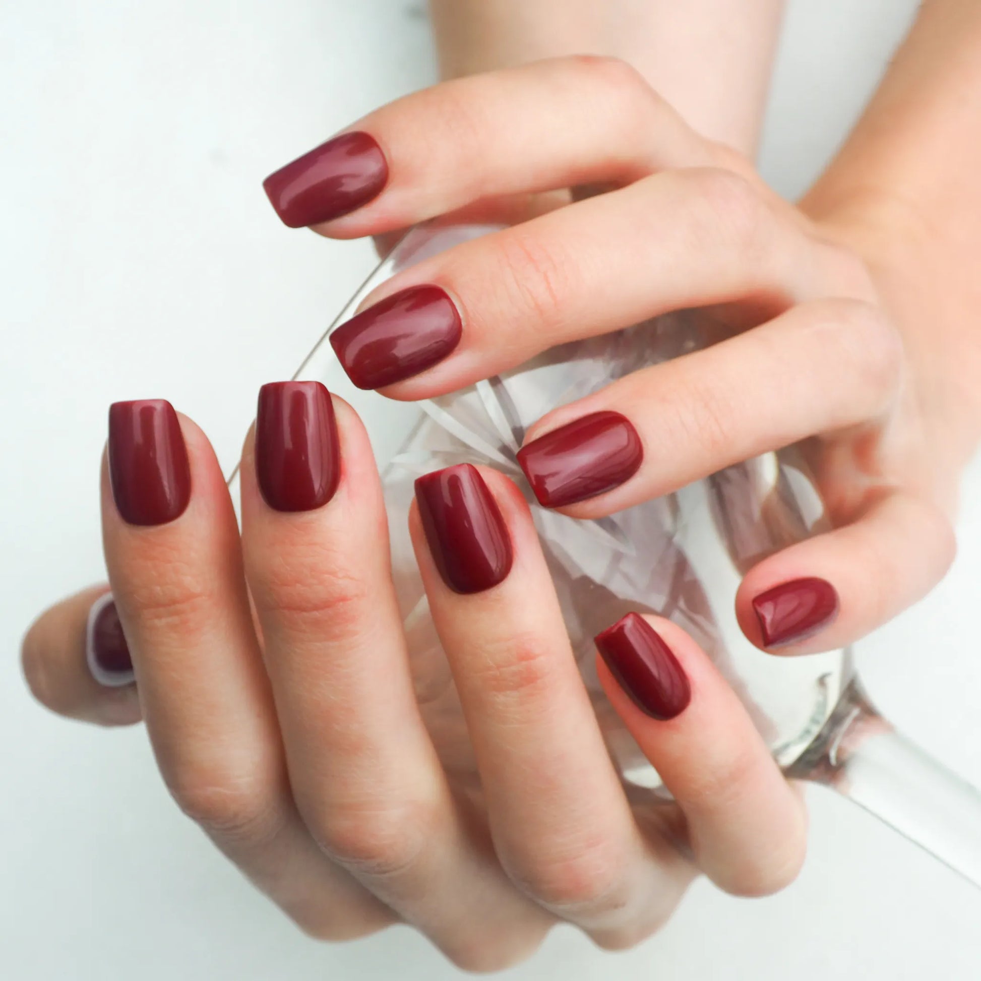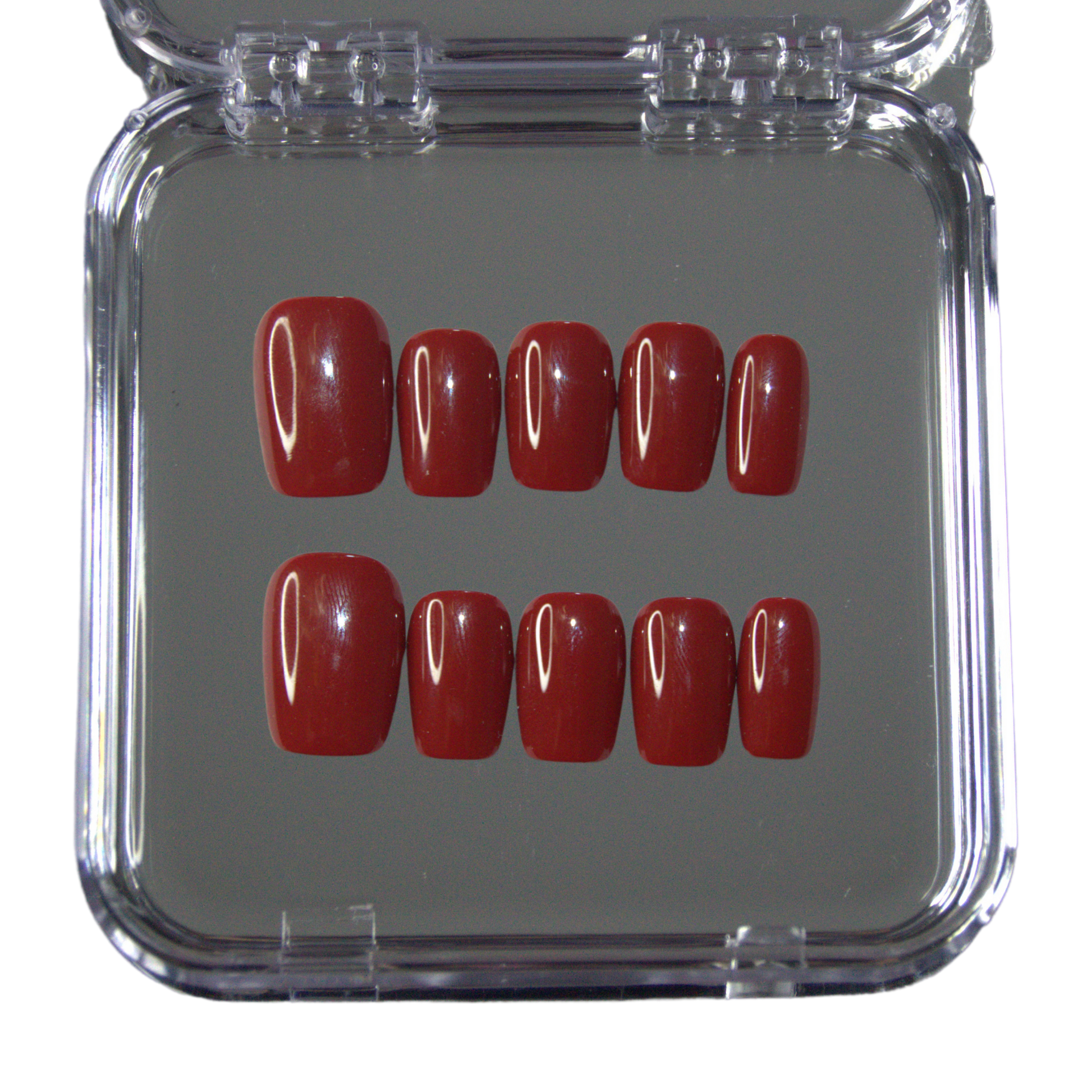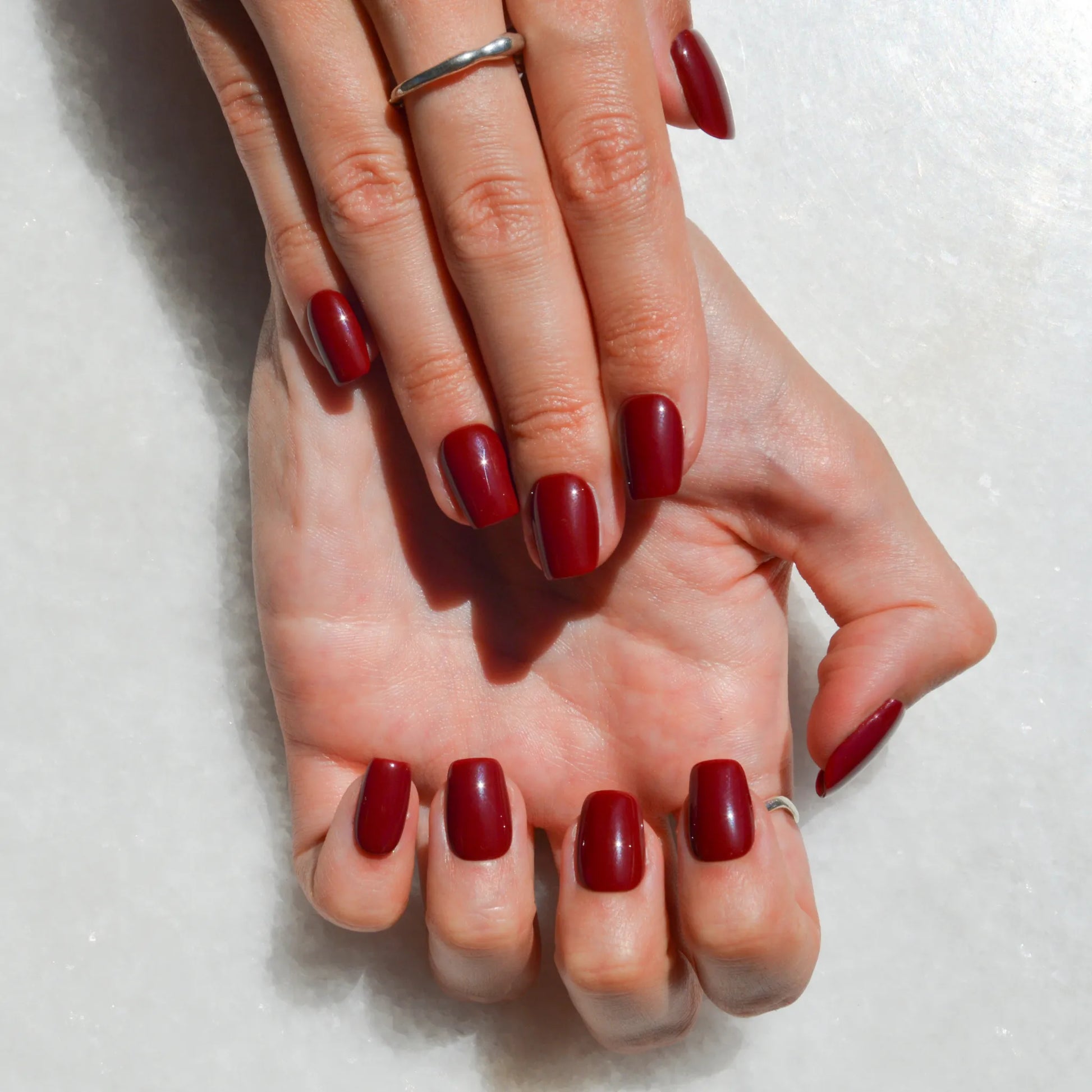 Faux ongles press-on faits main en rouge profond. Une teinte riche et sophistiquée qui capte la lumière et sublime chaque geste. L’élégance discrète mais affirmée pour celles qui aiment un rouge foncé intemporel.