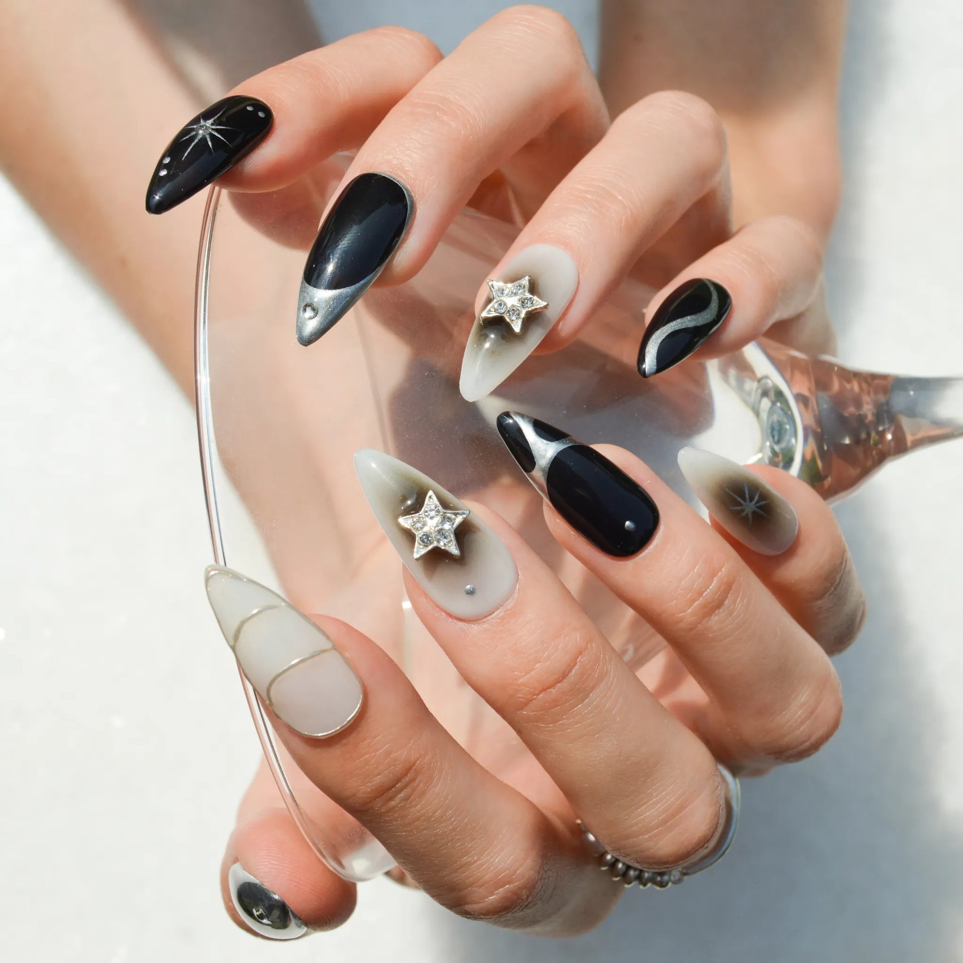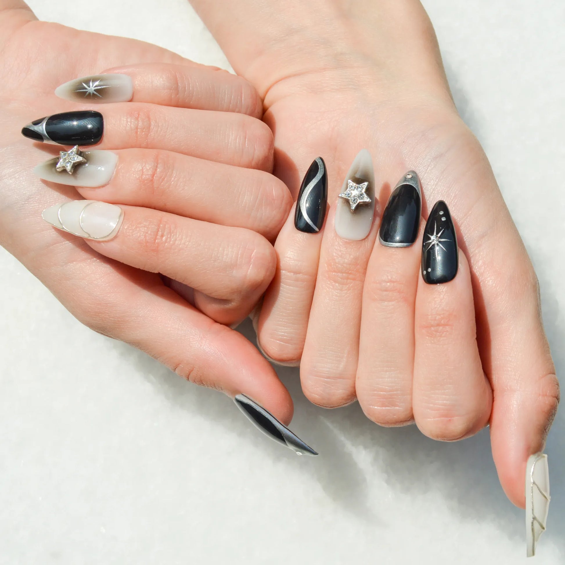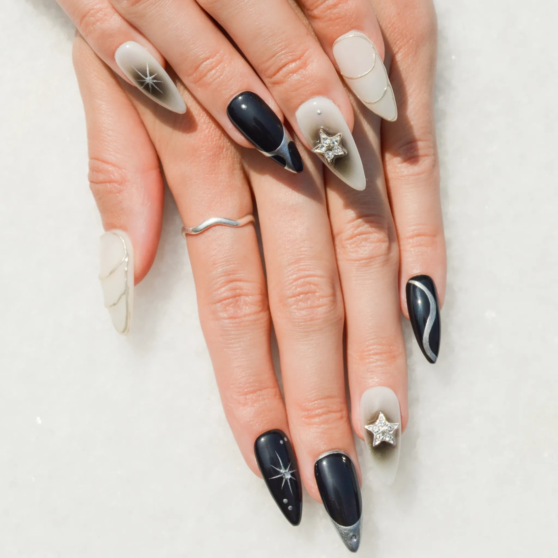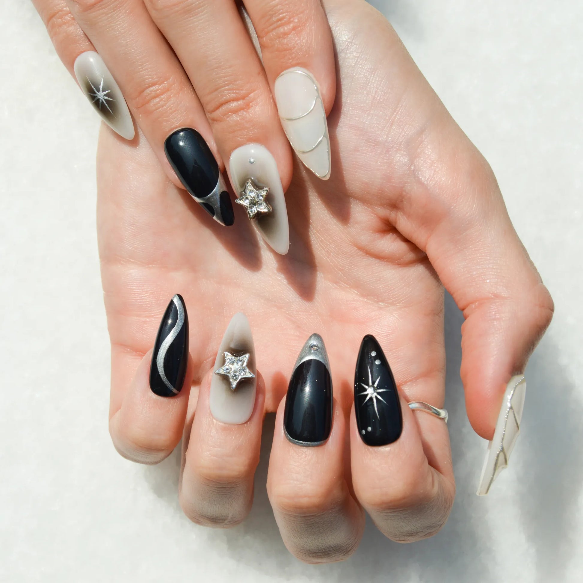 Faux ongles press-on faits main en noir, blanc et argent, agrémentés de détails métallisés et d’étoiles 3D. Contraste nuancé et finition brillante.