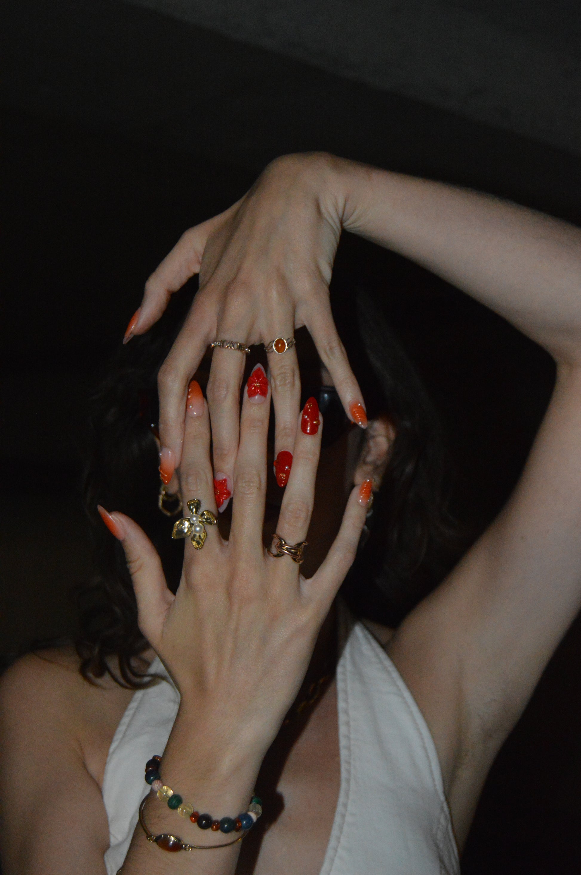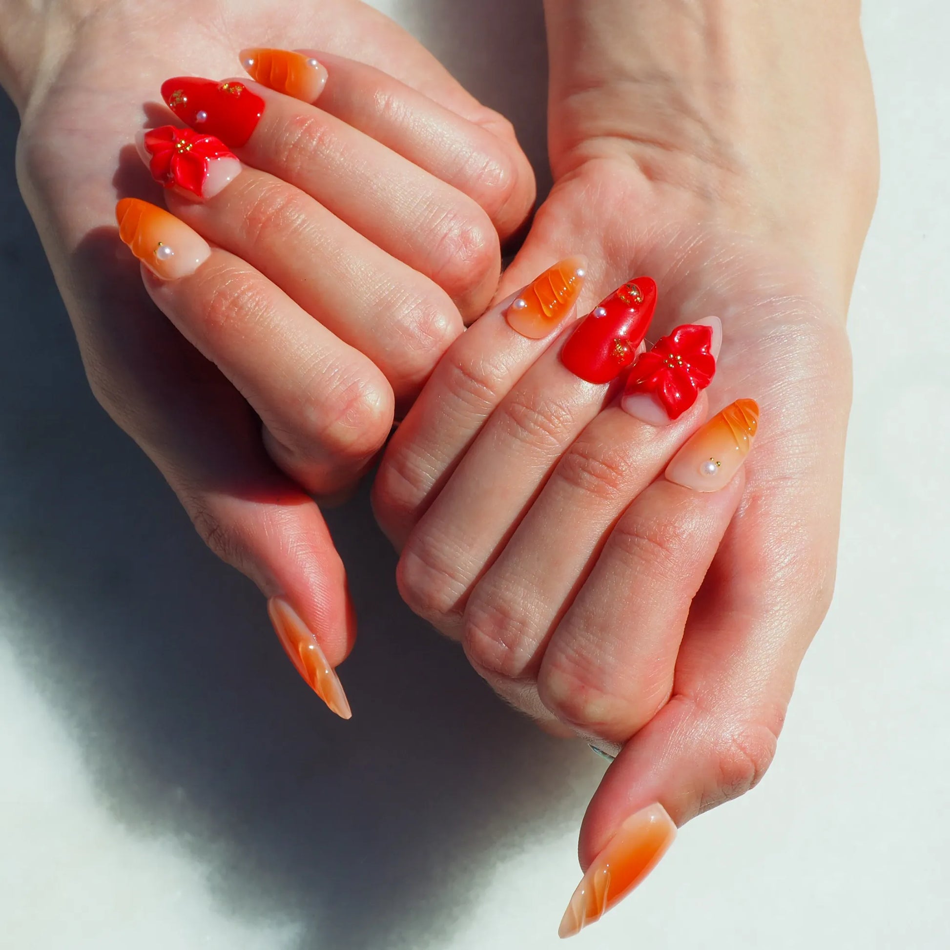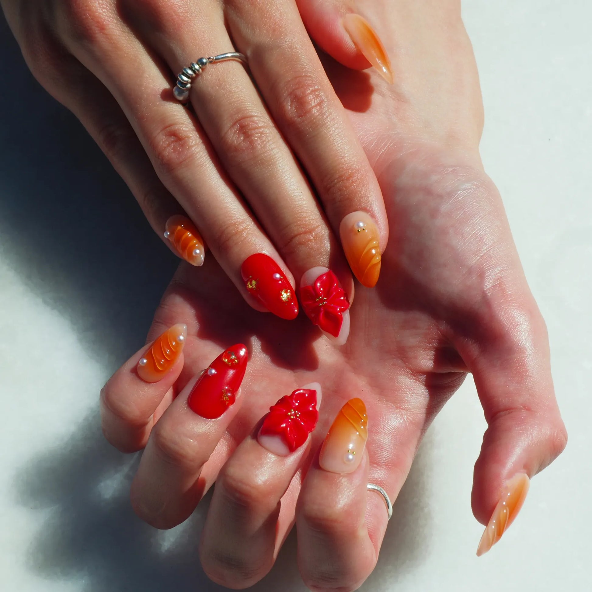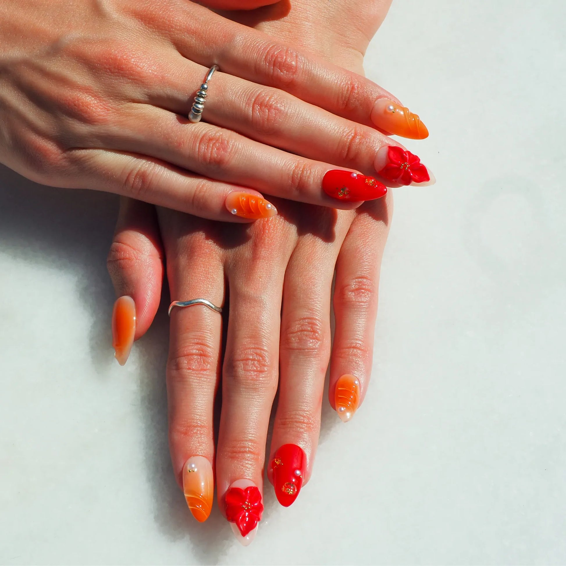 Faux ongles press-on faits main aux tons dégradés d’orange et de rouge, décorés de fleurs 3D, perles et éclats dorés. Un design lumineux et élégant qui évoque la chaleur et l’éclat d’un coucher de soleil.