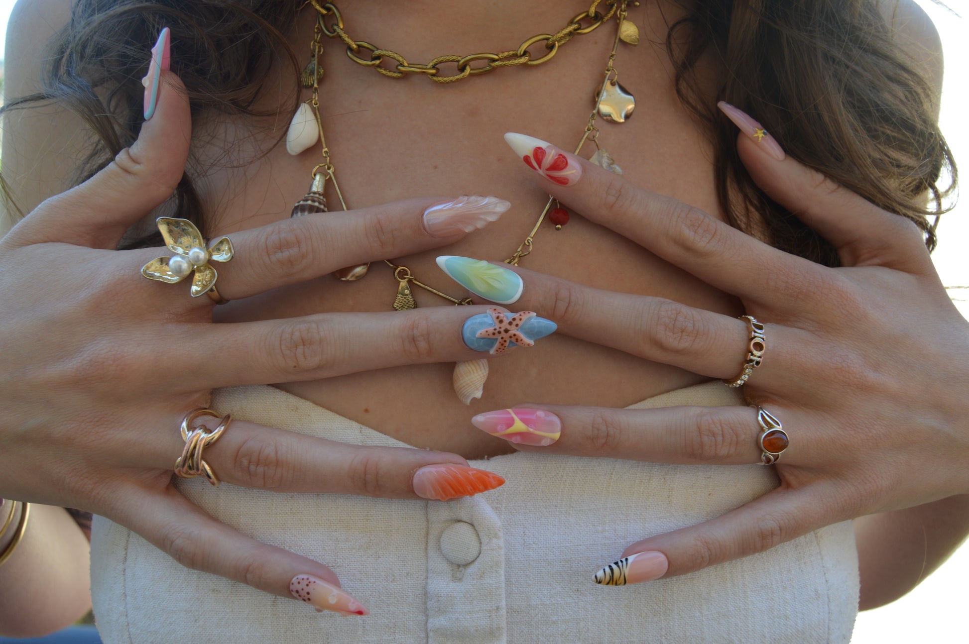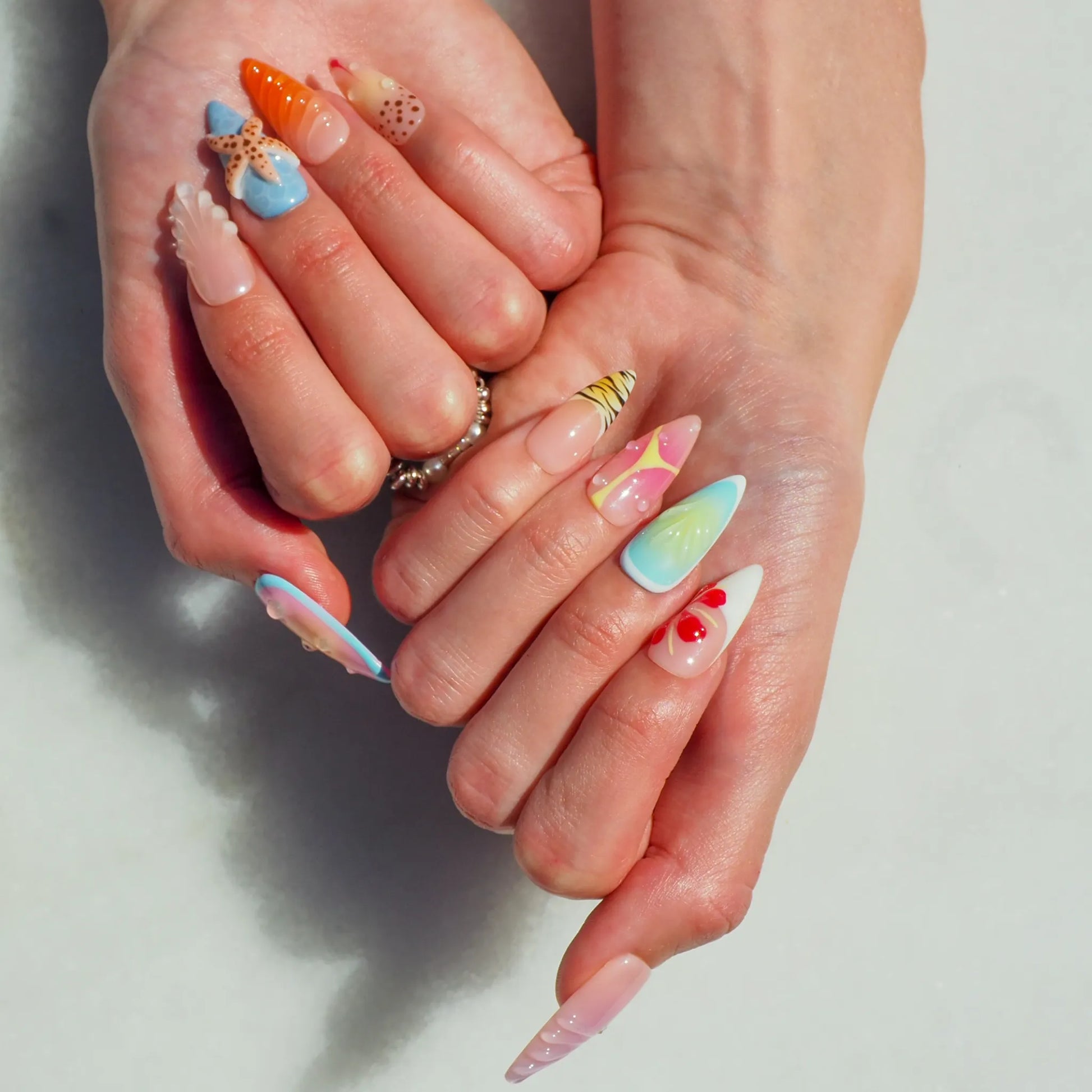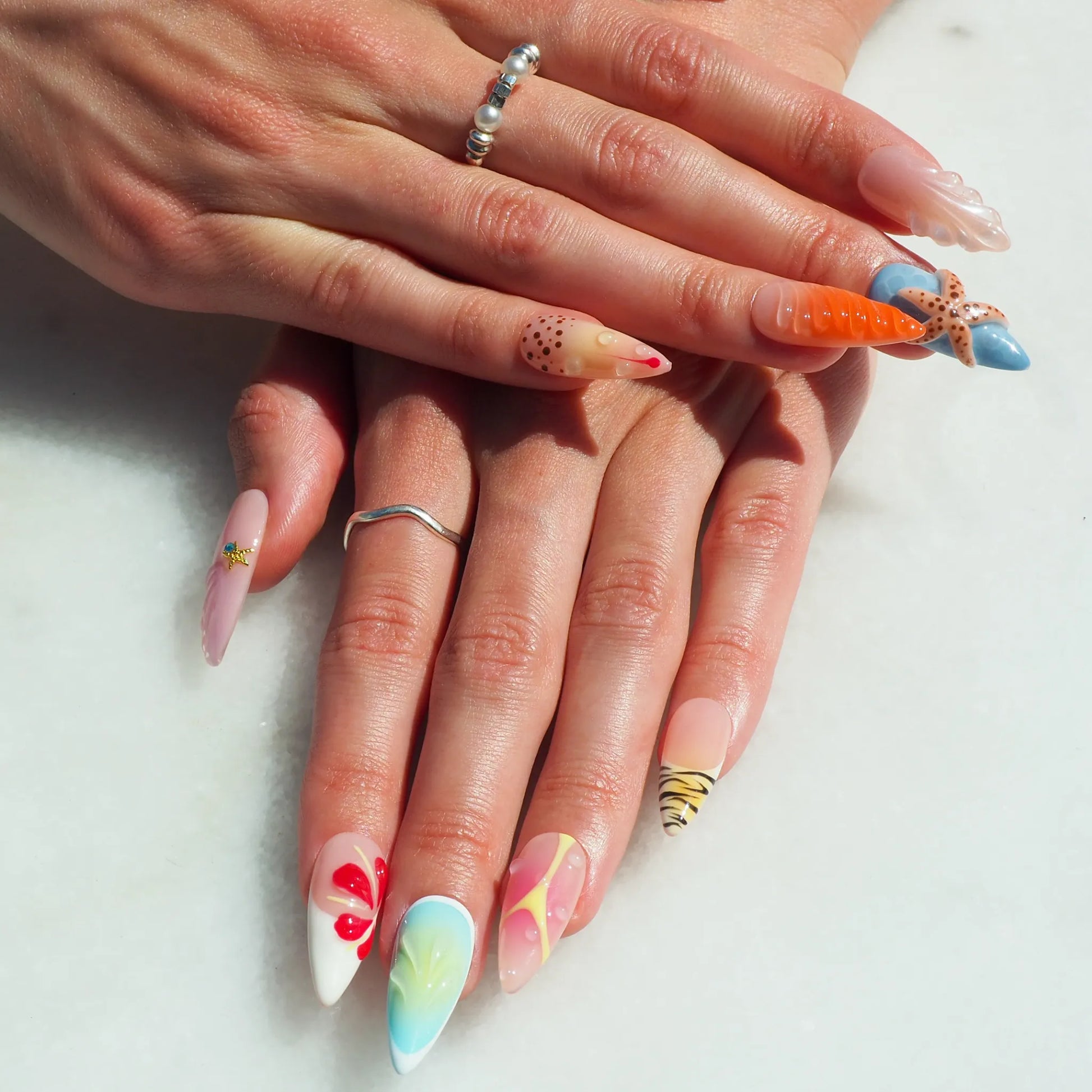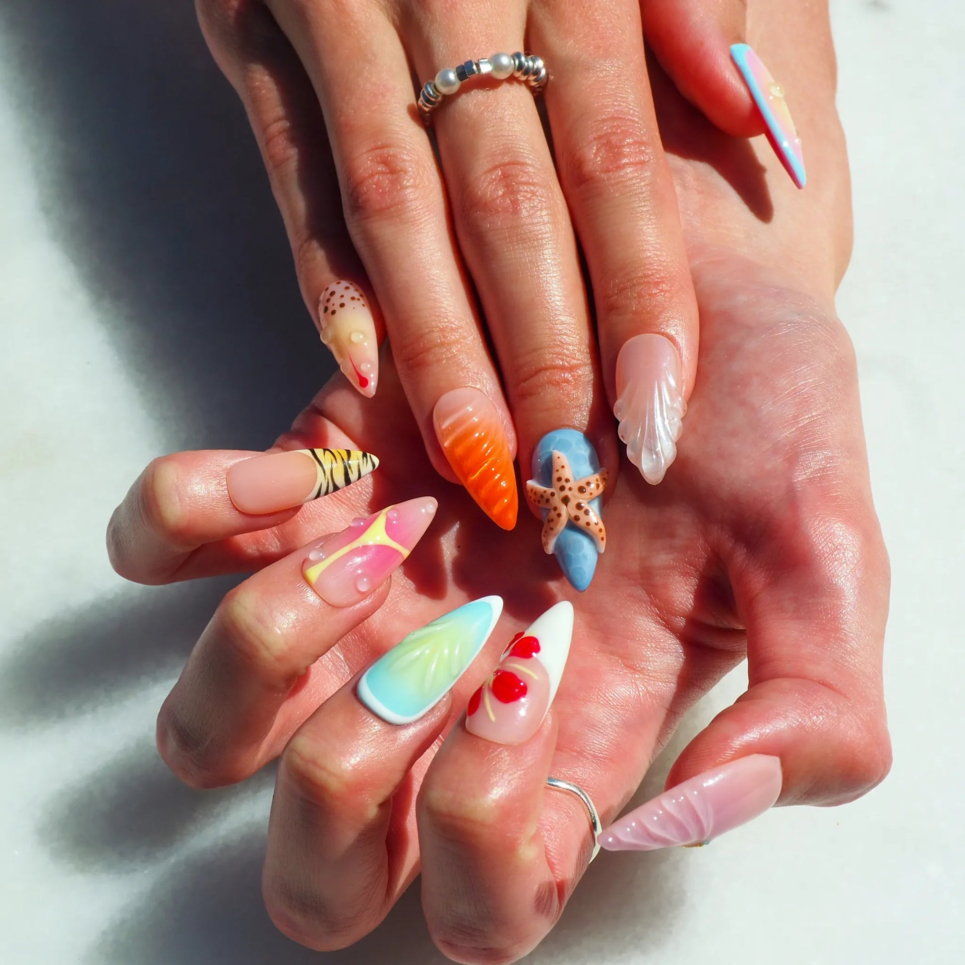 Faux ongles press-on faits main aux inspirations exotiques, mêlant motifs animaux, dégradés colorés et décorations 3D comme l’étoile de mer et les coquillages. Un design audacieux et ensoleillé qui apporte une touche originale et estivale à la manucure.