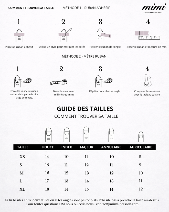Les modèles faits main, comme chez Mimi, sont plus solides, plus épais et offrent des finitions uniques et travaillés. Les press-on industriels sont souvent plus fragiles et moins détaillés. Pour les reconnaitre, les press-on nails faits machine ont souvent un bout de plastique à l'extrémité de l'ongle qu'il faut limer.