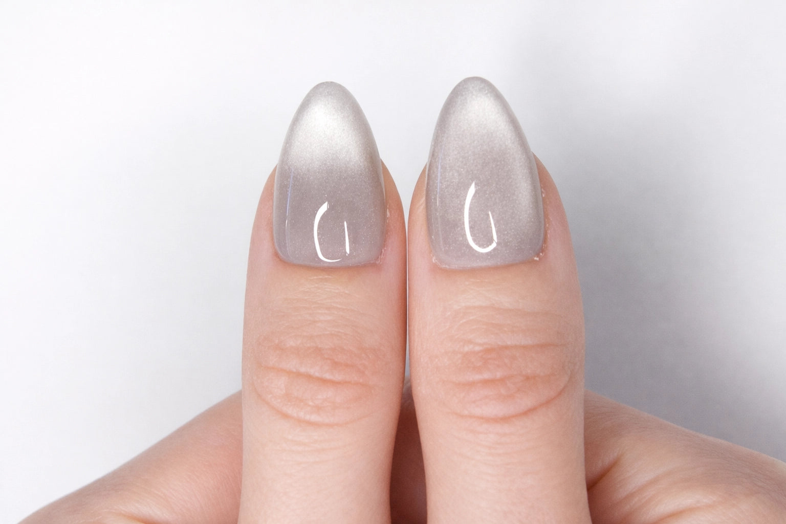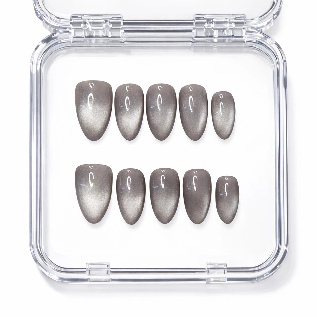 Un gris acier envoûtant aux reflets magnétiques cat eye, pour des ongles qui captent la lumière à chaque mouvement. La forme amande allongée affine les doigts et apporte une touche élégance.