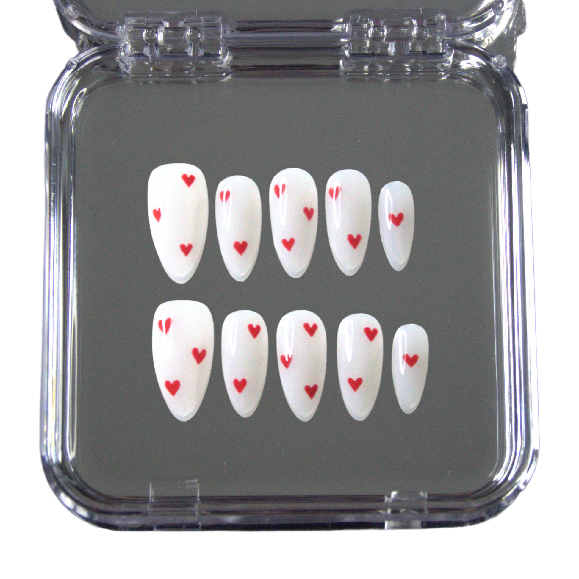 Faux ongles press-on faits main sur base blanche, ornés de cœurs rouges éclatants. Un design romantique et audacieux, parfait pour apporter une touche originale et séduisante à ta manucure.