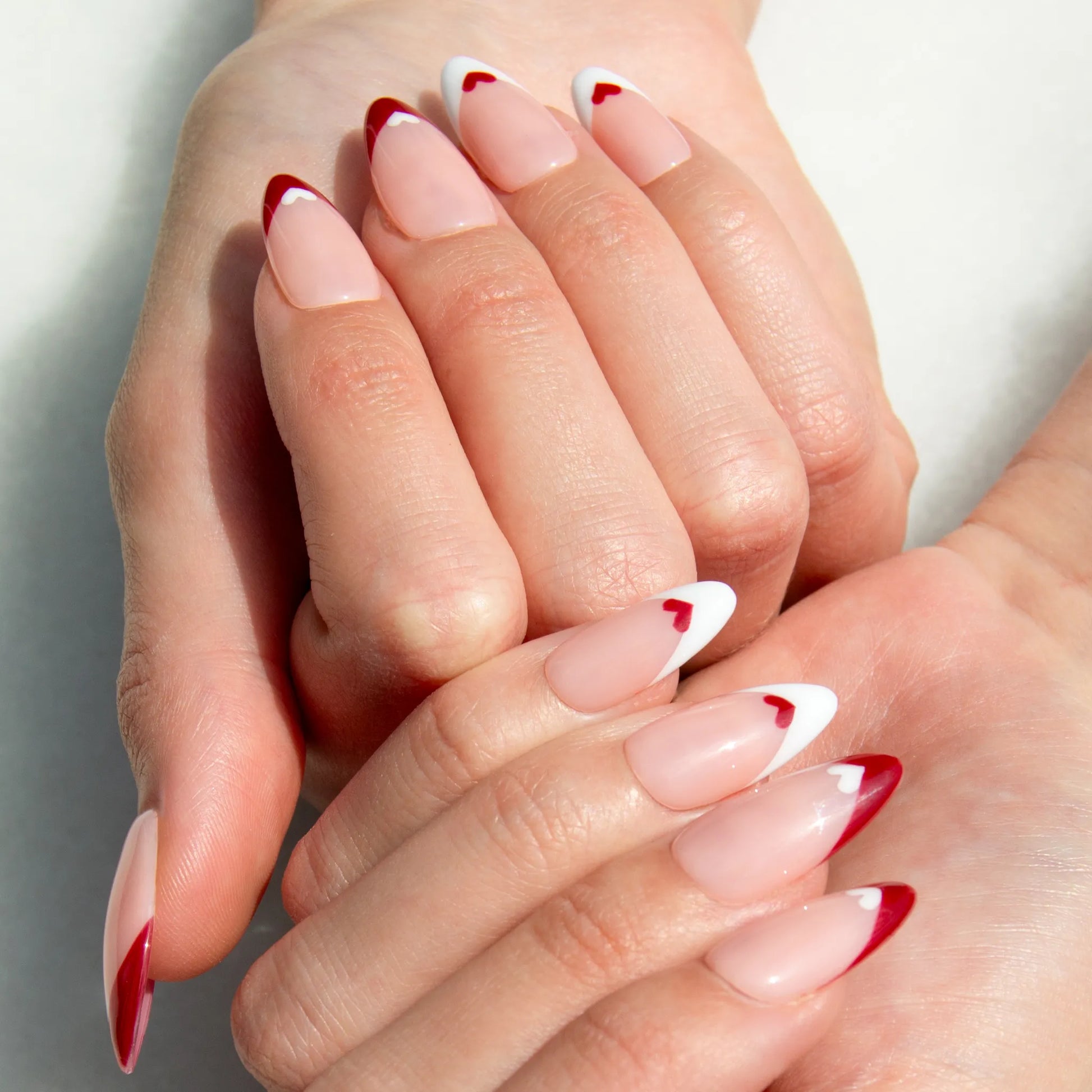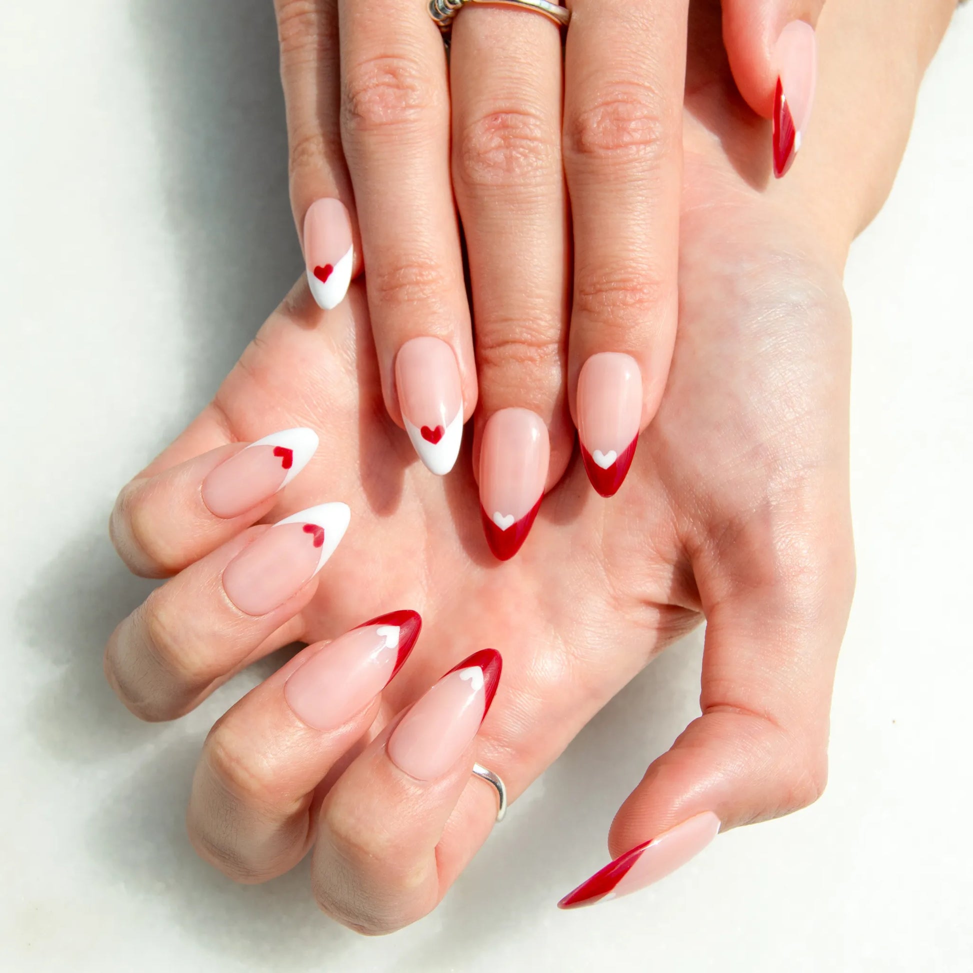Faux ongles press-on faits main avec une base nude et un french rouge ou blanc, décorés d’un petit cœur au centre. Un design élégant et romantique qui met en valeur la manucure avec simplicité et originalité.