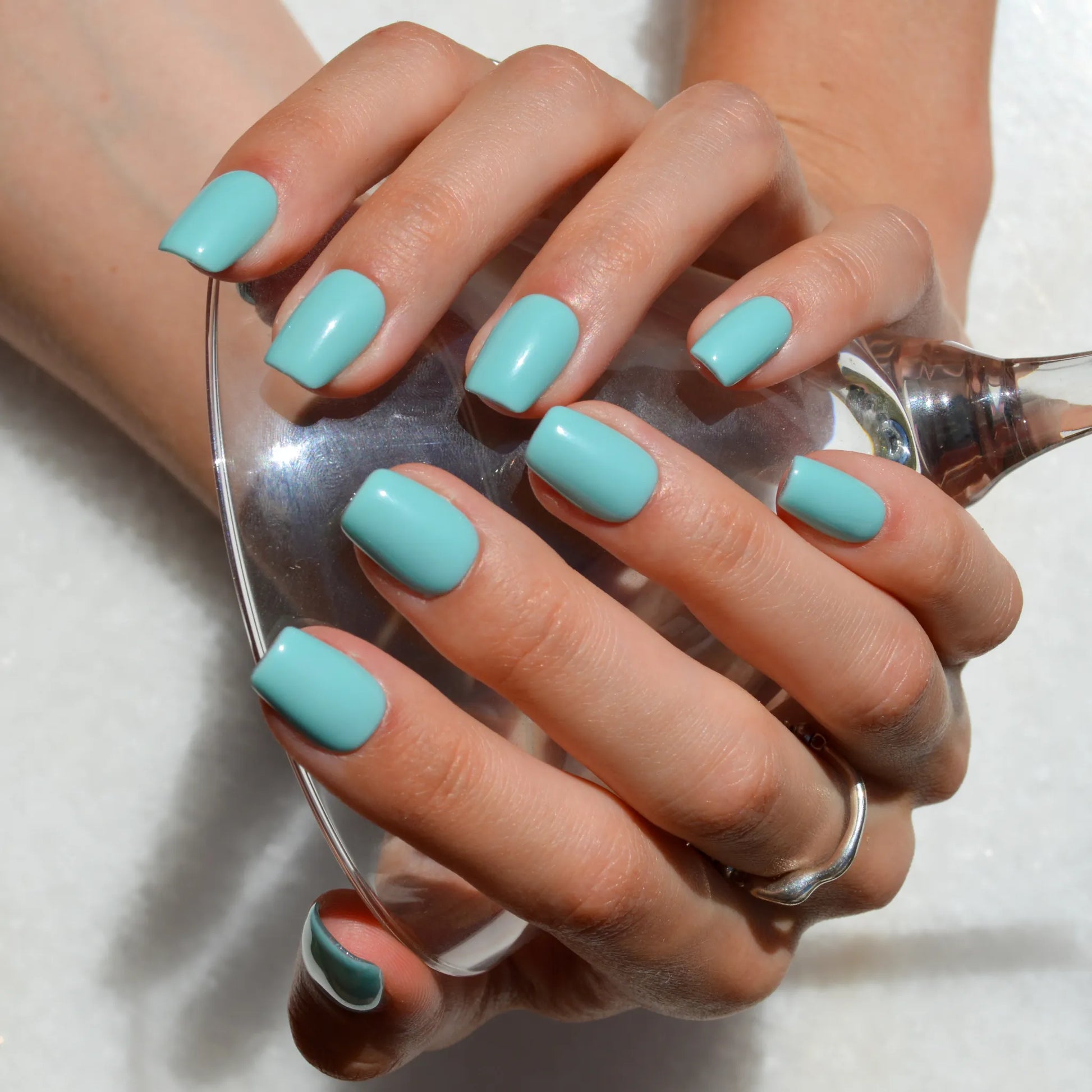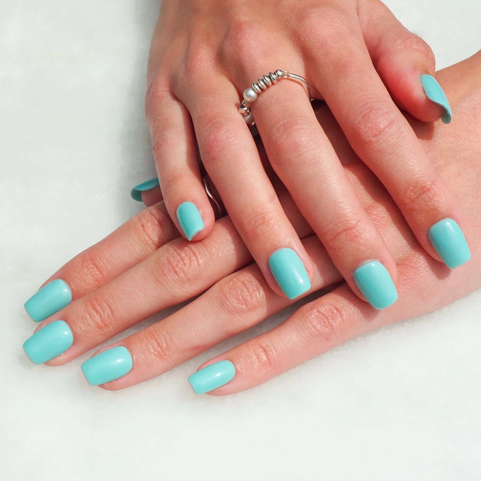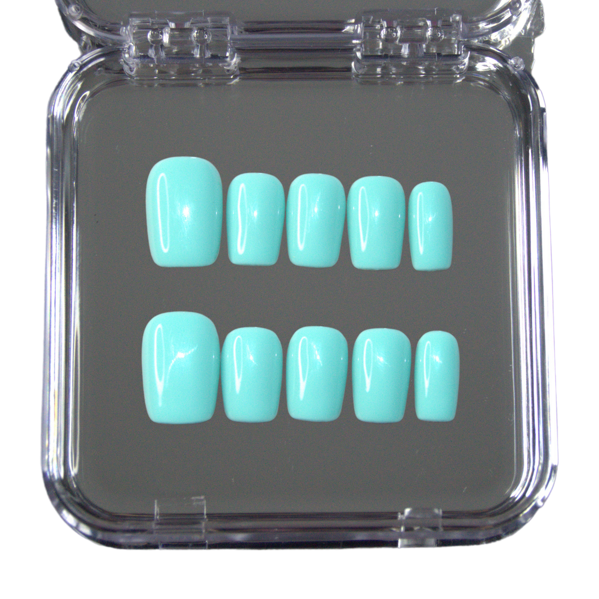 Faux ongles press-on faits main en turquoise lumineux, au fini lisse et brillant. Un design simple et éclatant qui apporte une touche colorée et élégante à la manucure.