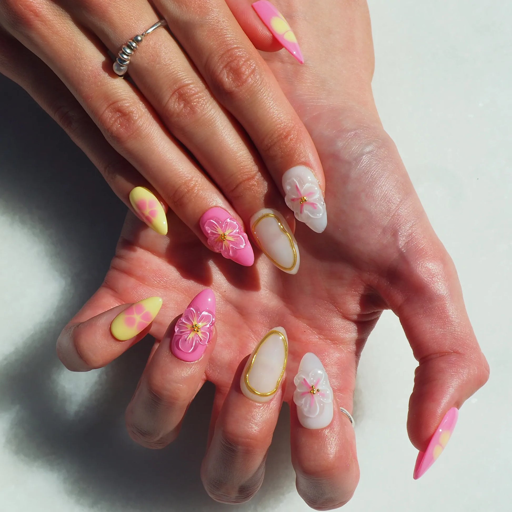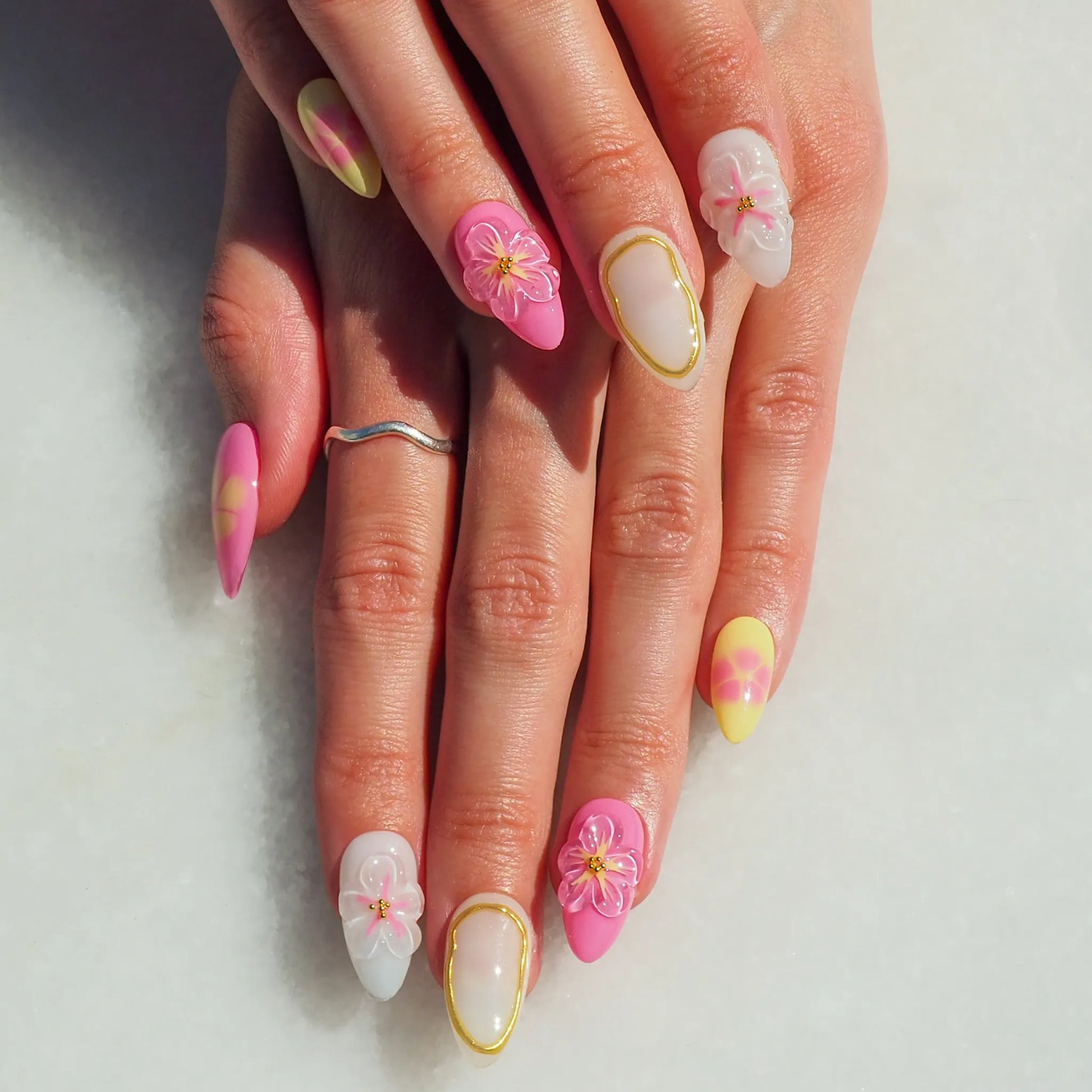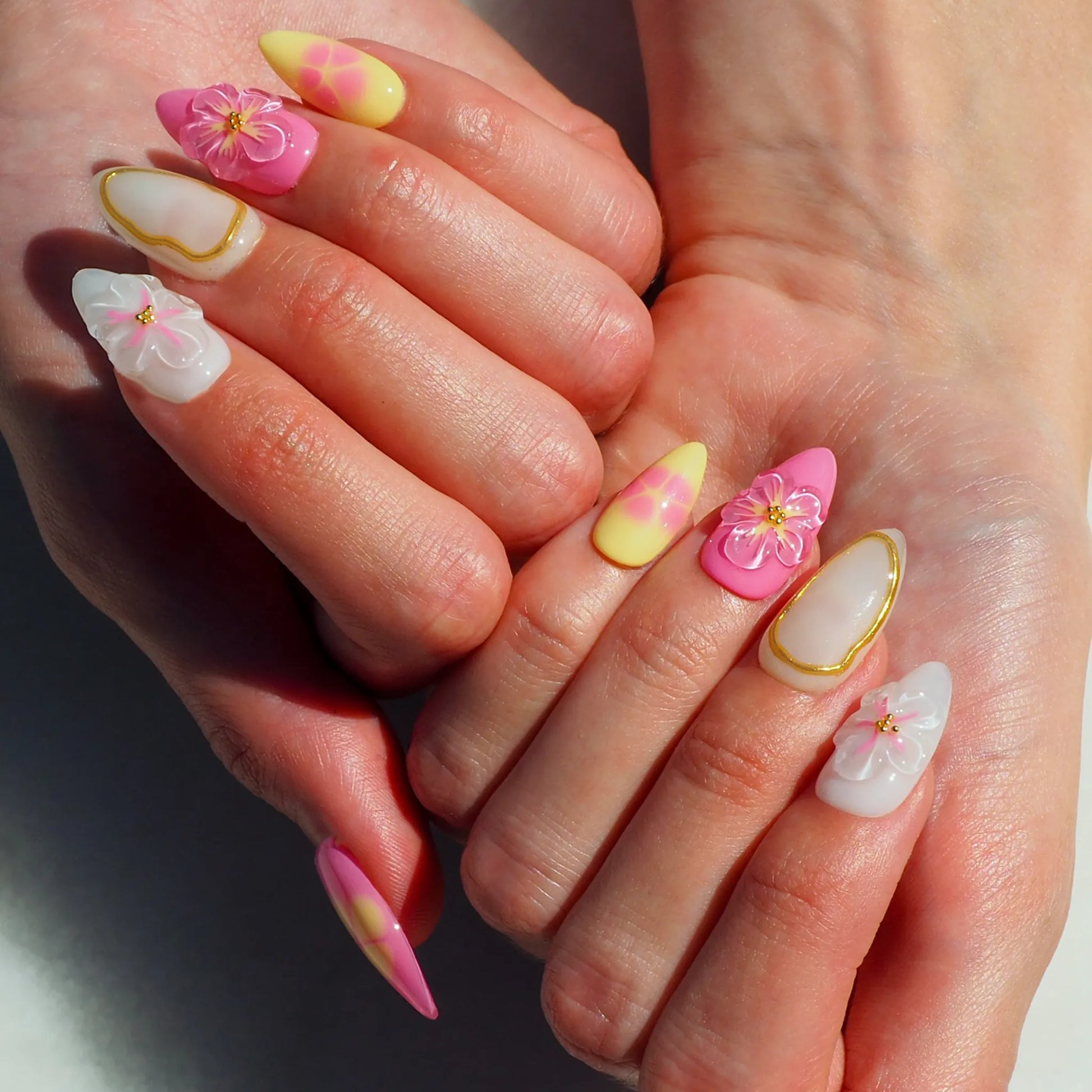 Faux ongles press-on faits main en rose, blanc et jaune, ornés de fleurs 3D et de contours dorés. Un design éclatant et raffiné qui apporte une touche ensoleillée et élégante à la manucure.