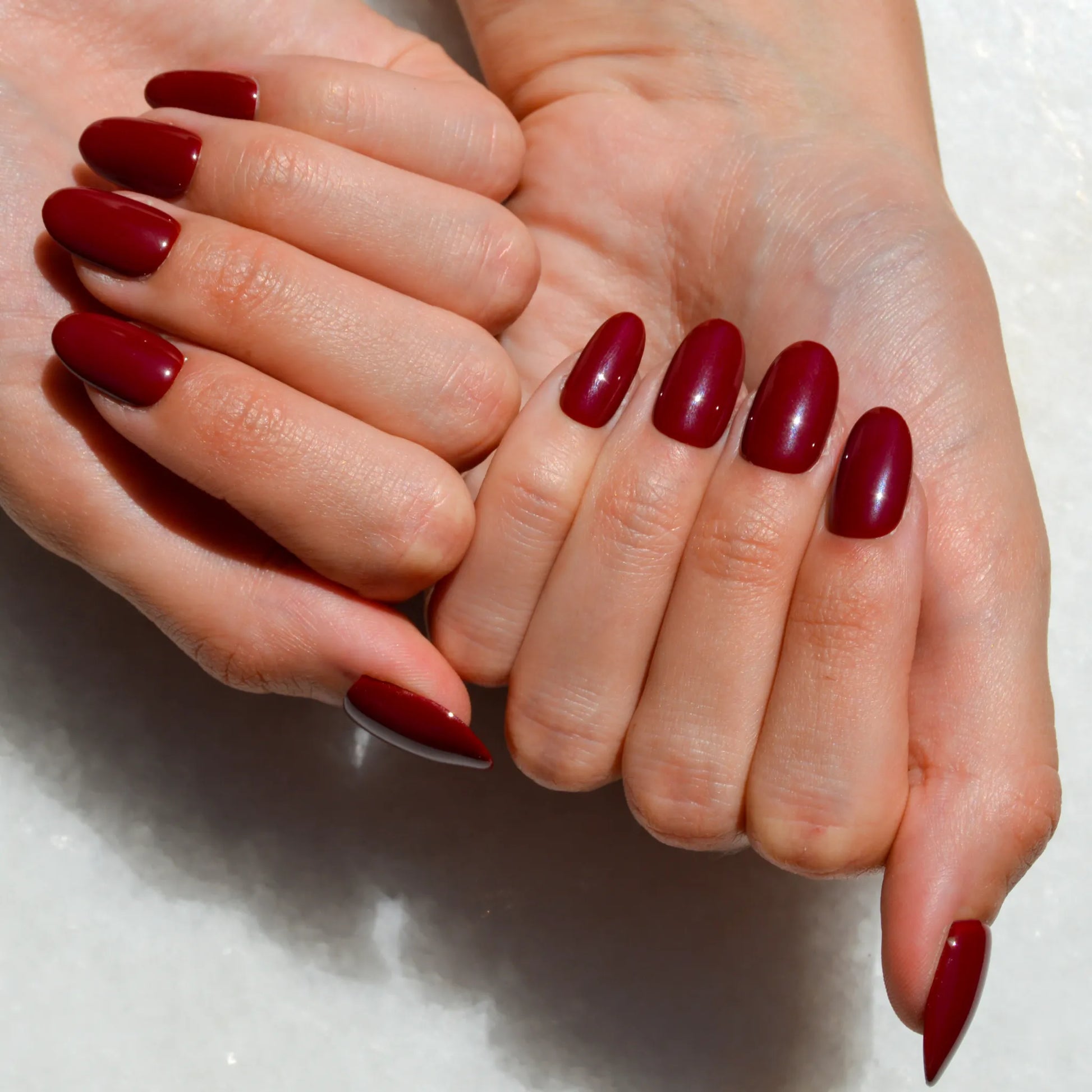 Faux ongles press-on faits main d’un rouge intense et profond. Un incontournable intemporel qui incarne l’élégance et la passion, idéal pour une manucure raffinée en toute occasion.