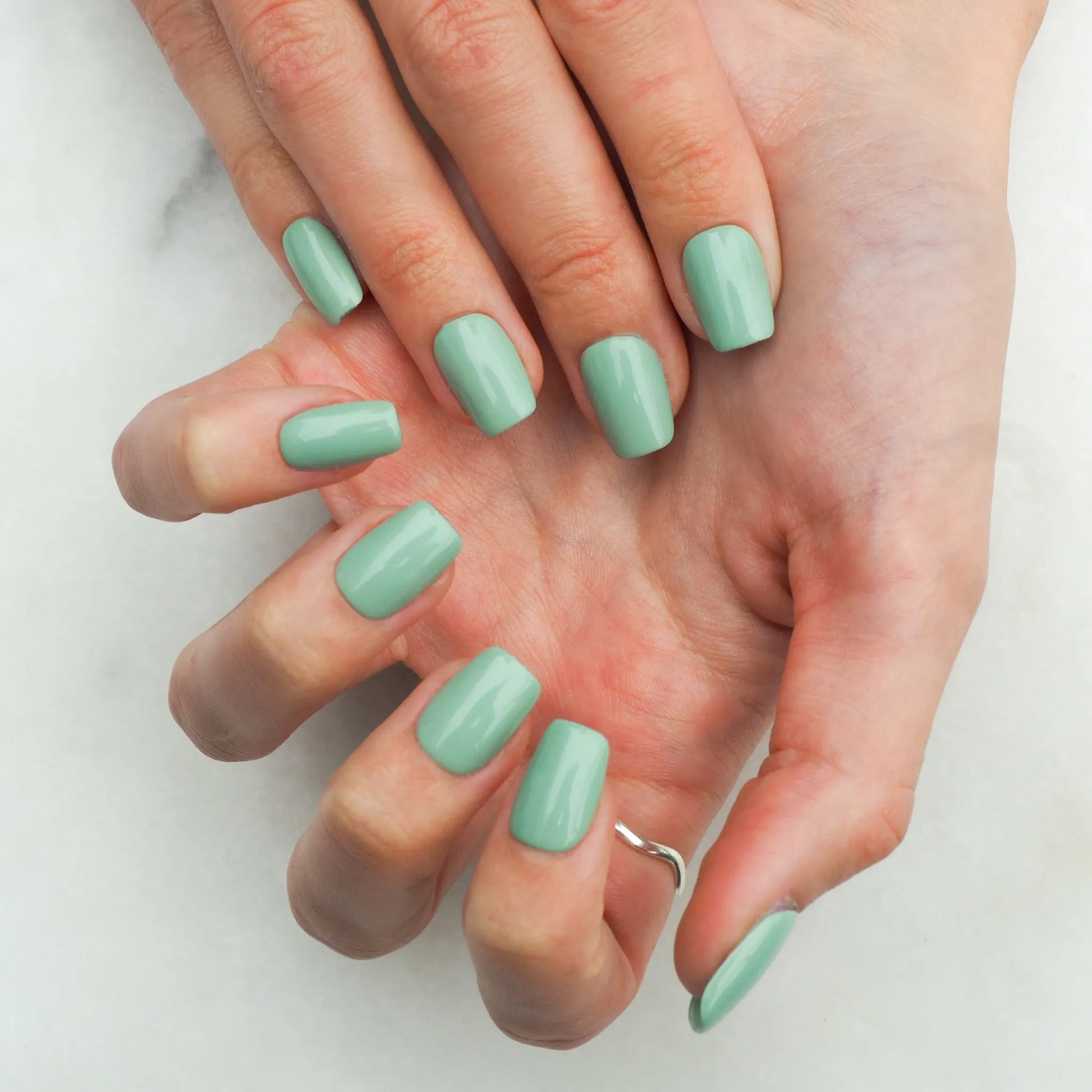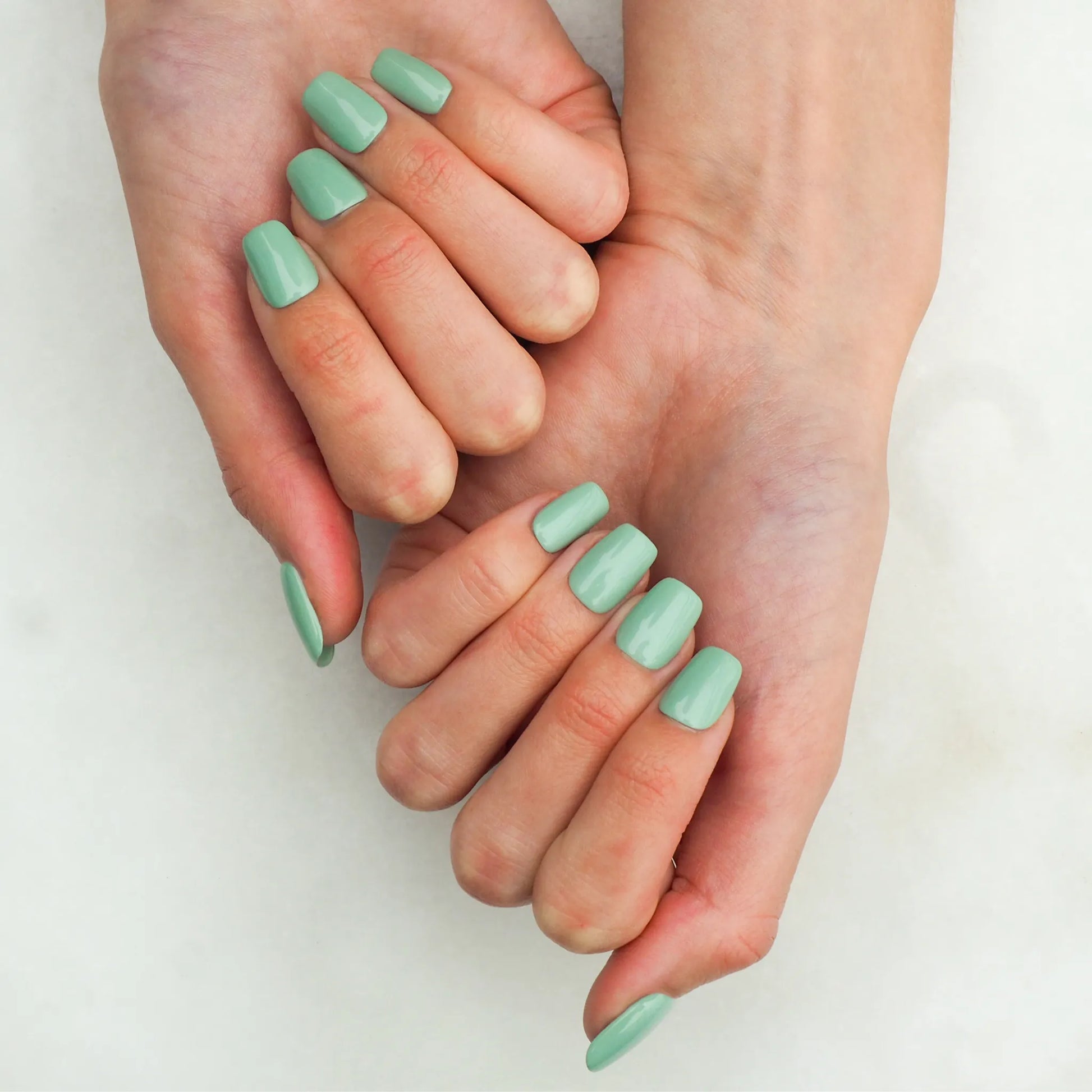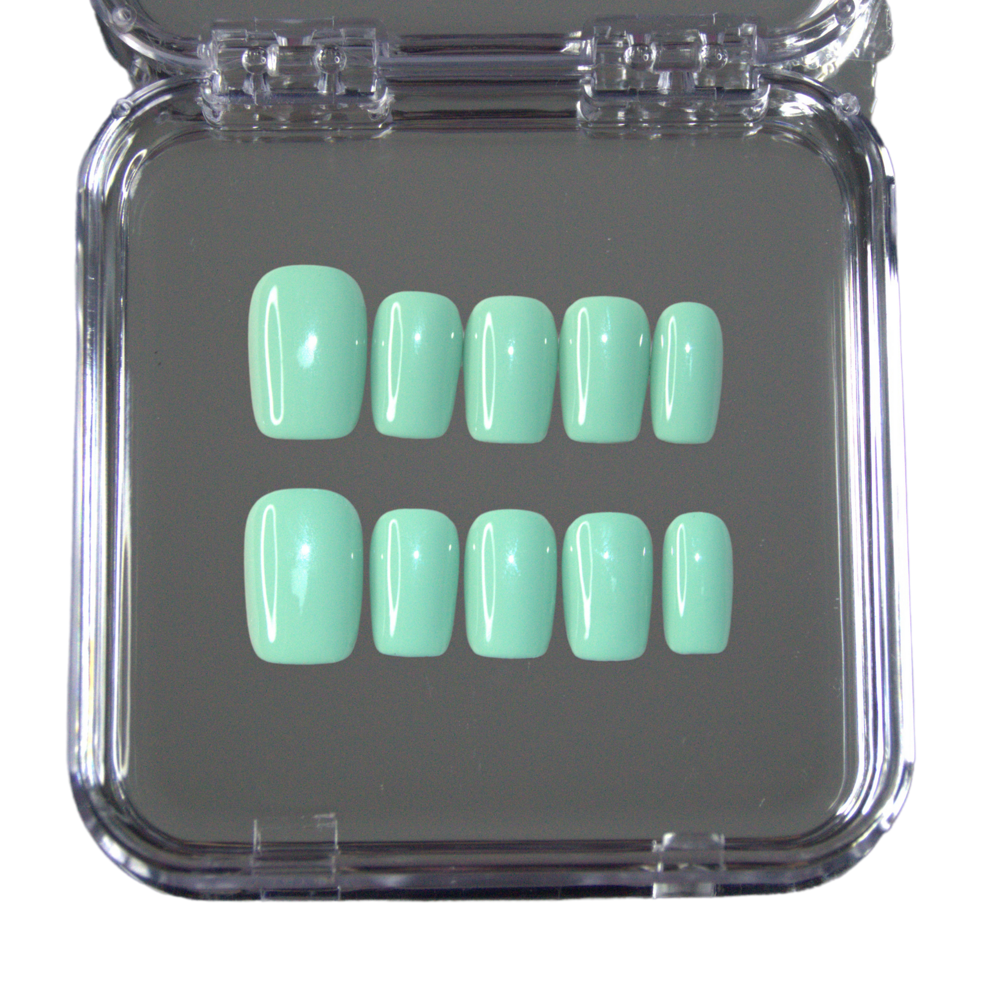 Faux ongles press-on faits main en vert pâle, au fini lisse et brillant. Une teinte douce et moderne qui apporte fraîcheur et élégance à la manucure.