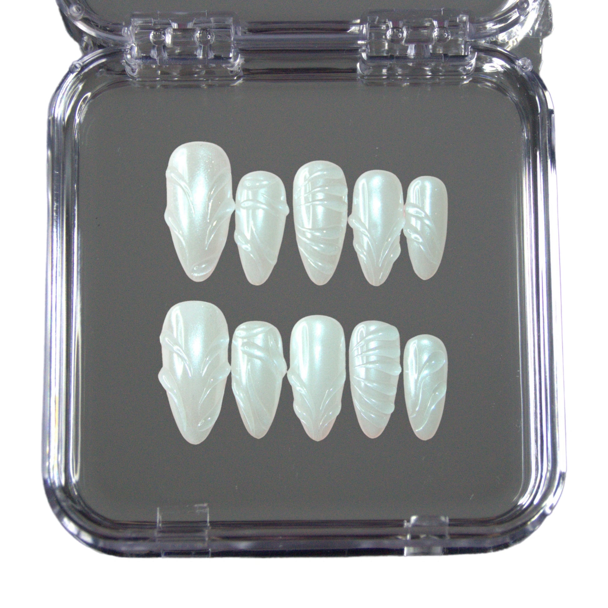 Faux ongles press-on faits main en blanc nacré, ornés de reliefs 3D élégants. Un design minimaliste et raffiné qui illumine la manucure avec une touche subtile et sophistiquée.