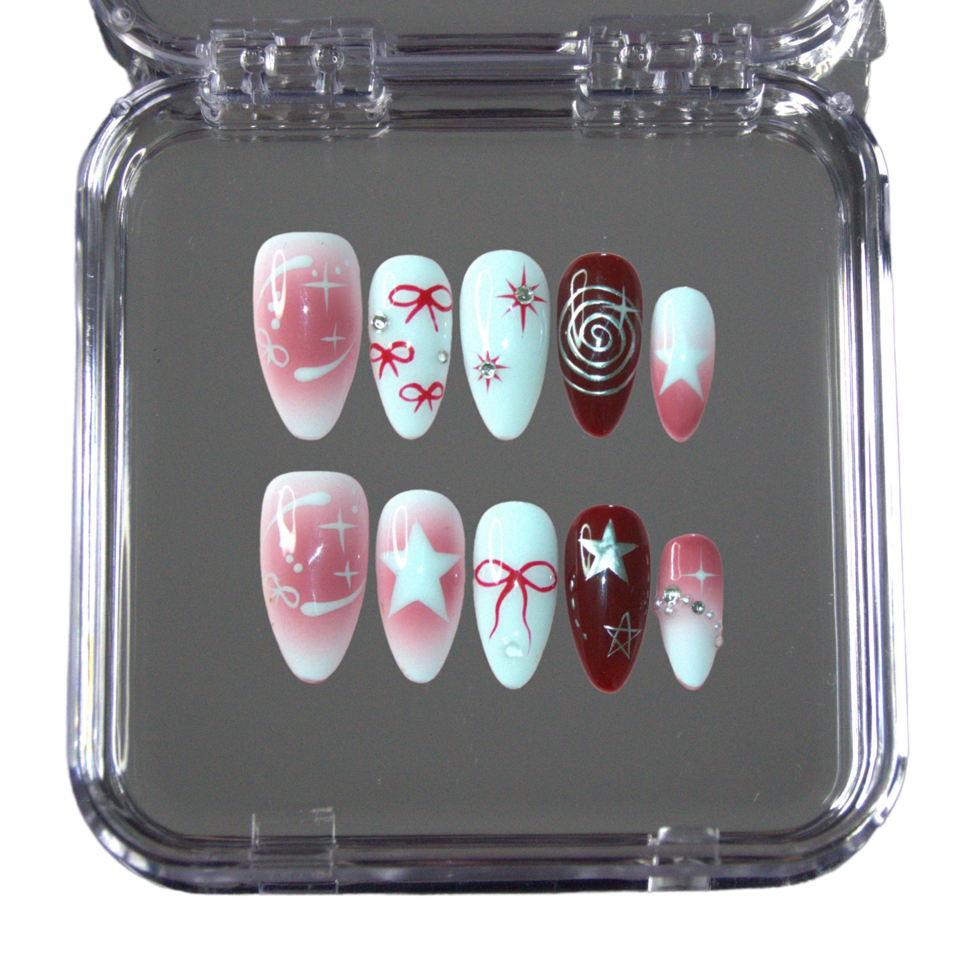Faux ongles press-on faits main en rouge, blanc et rose dégradé, décorés de nœuds, étoiles et détails brillants. Un design festif et élégant qui apporte une touche graphique et originale à la manucure.