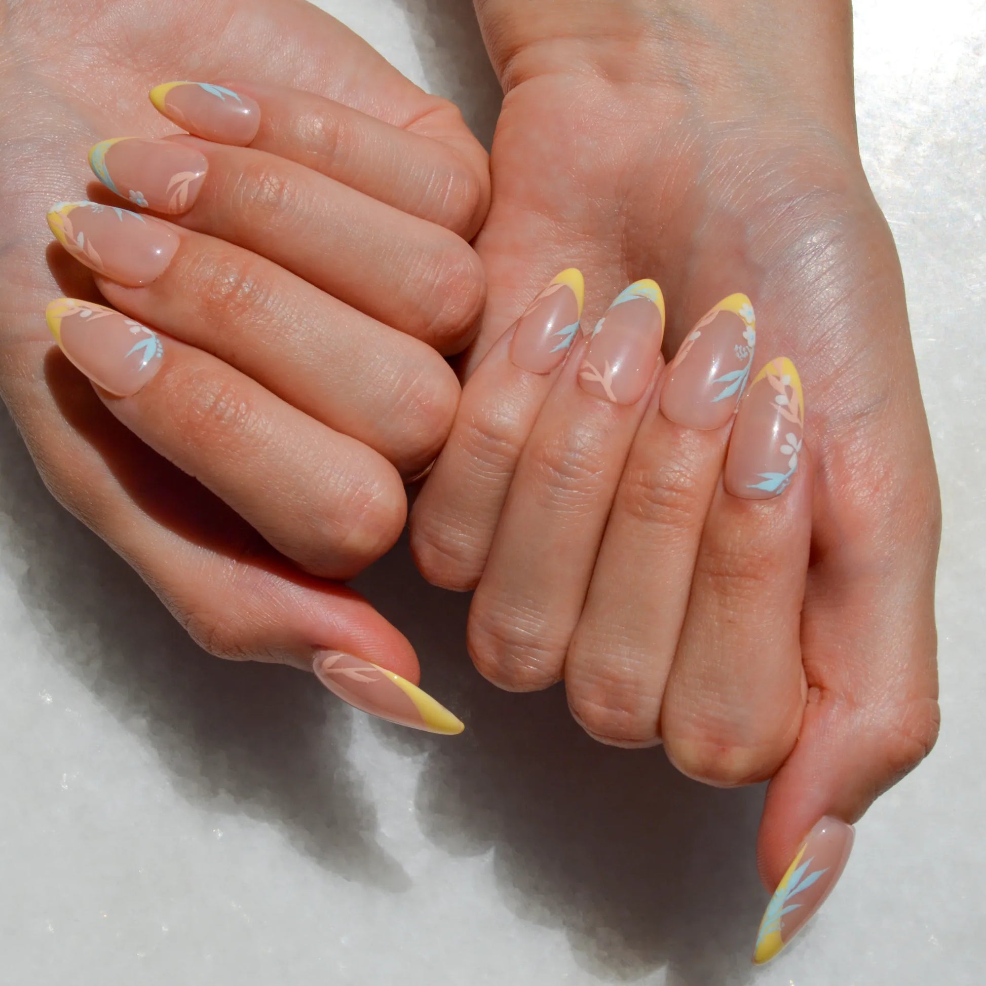 Ces faux ongles press-on faits main associent une base nude élégante à un french jaune pastel, délicatement décoré de fleurs et feuillages. Idéal pour un look lumineux et féminin en toute saison.