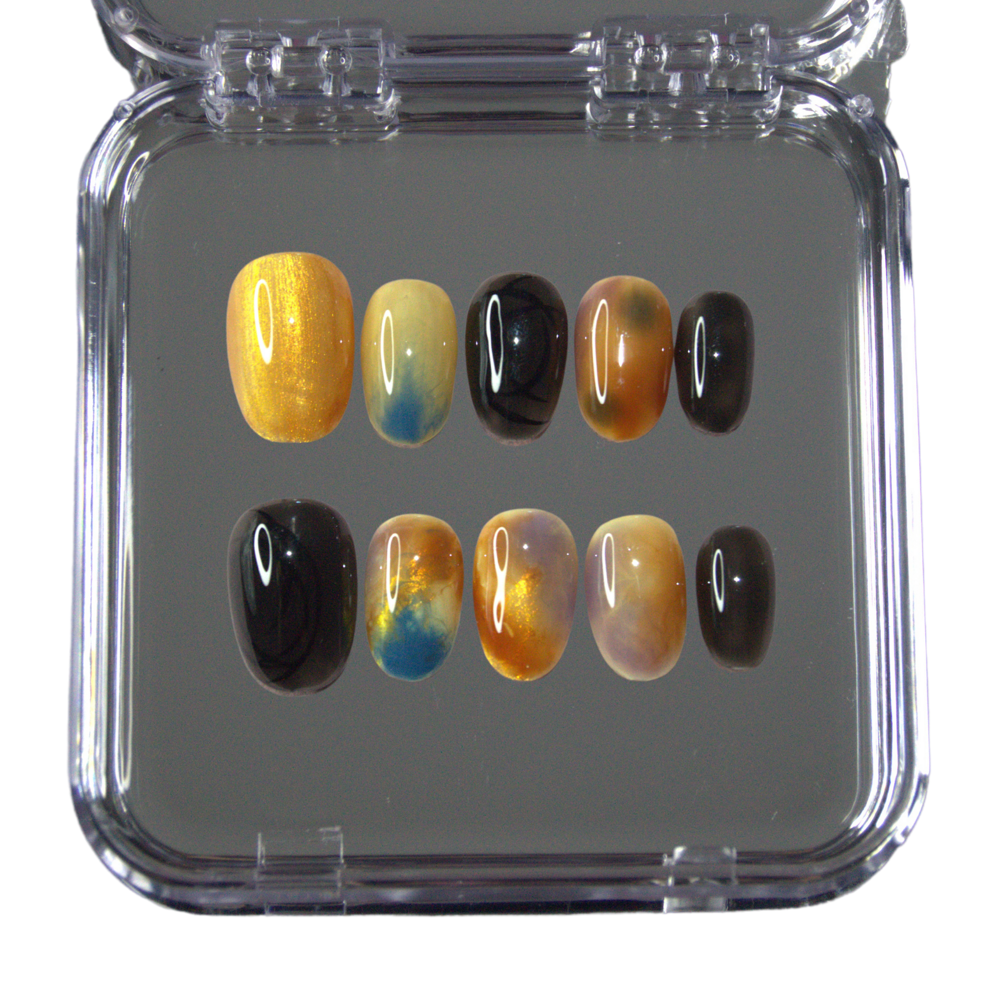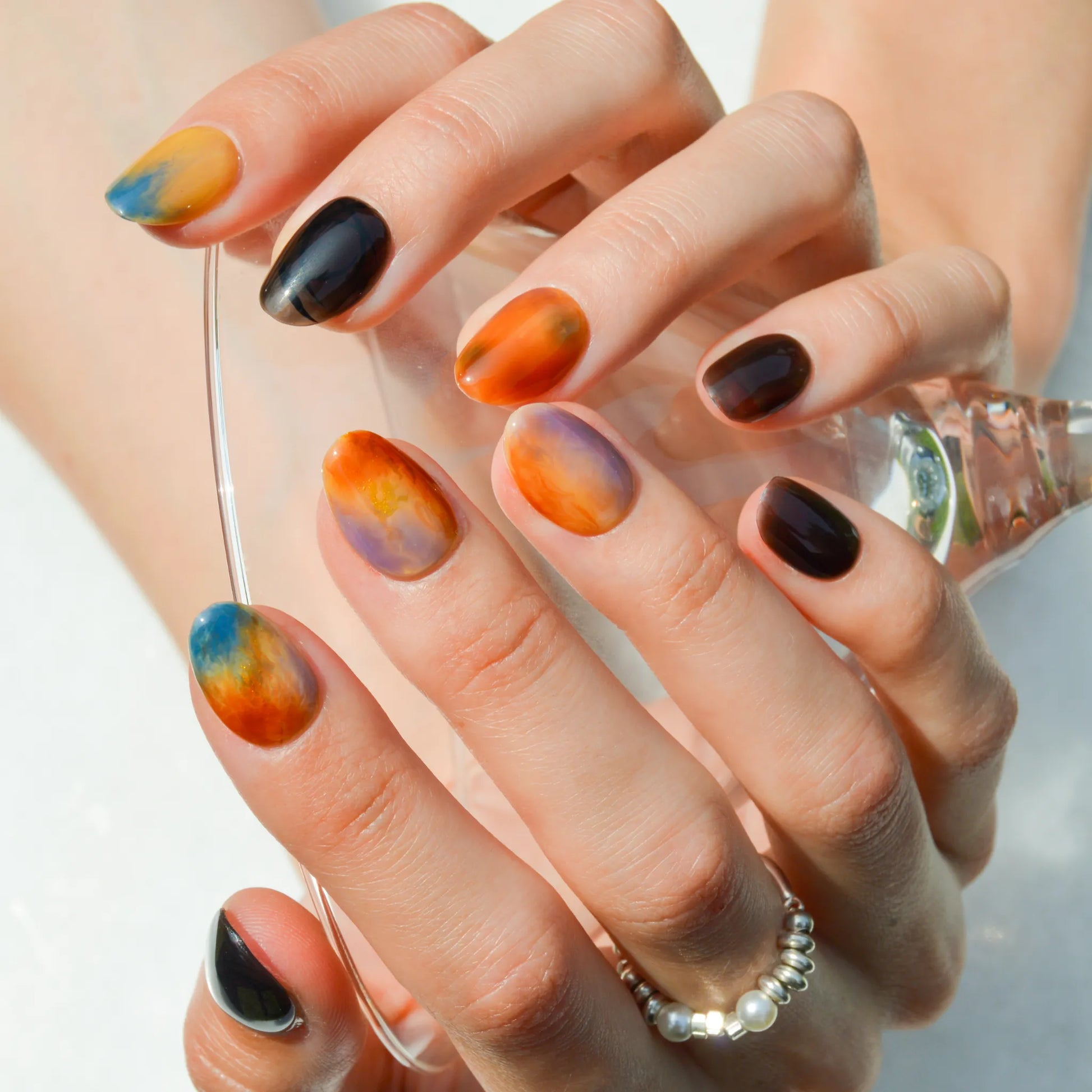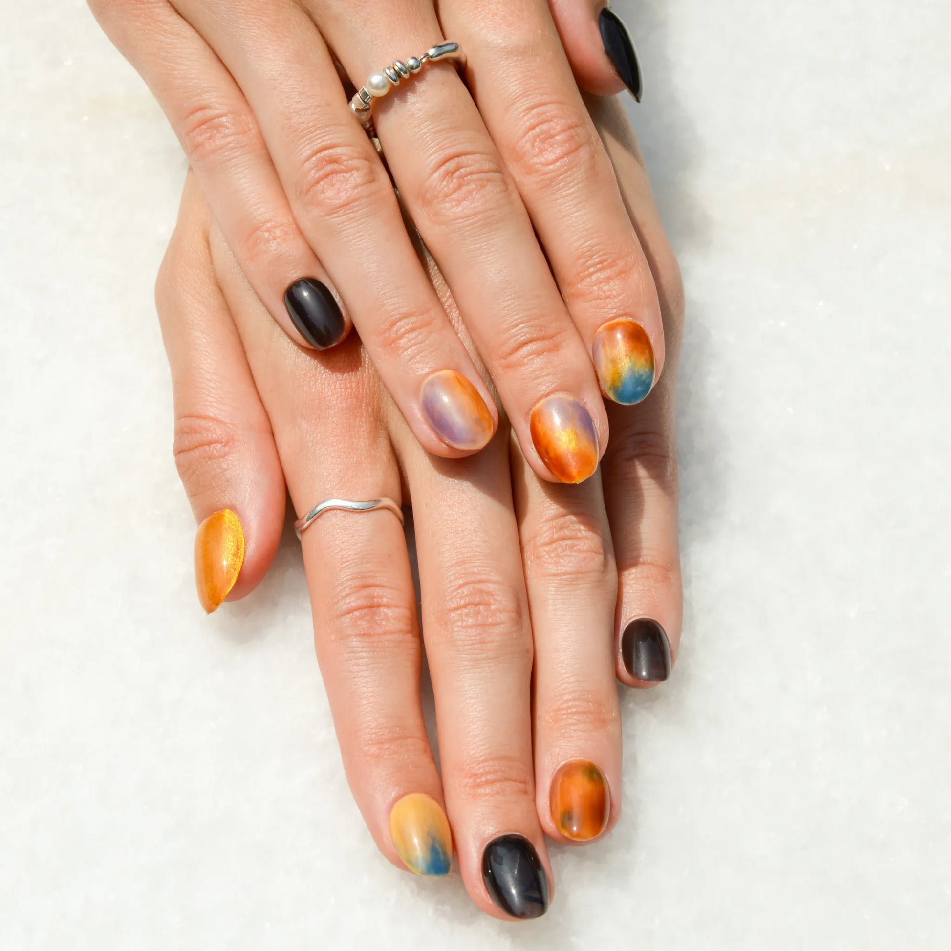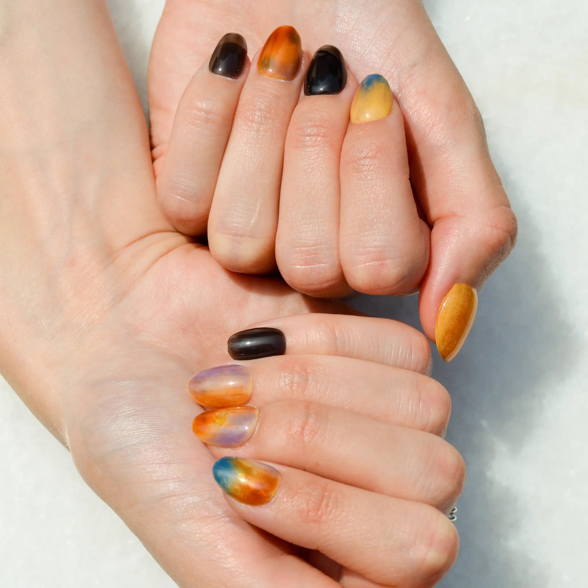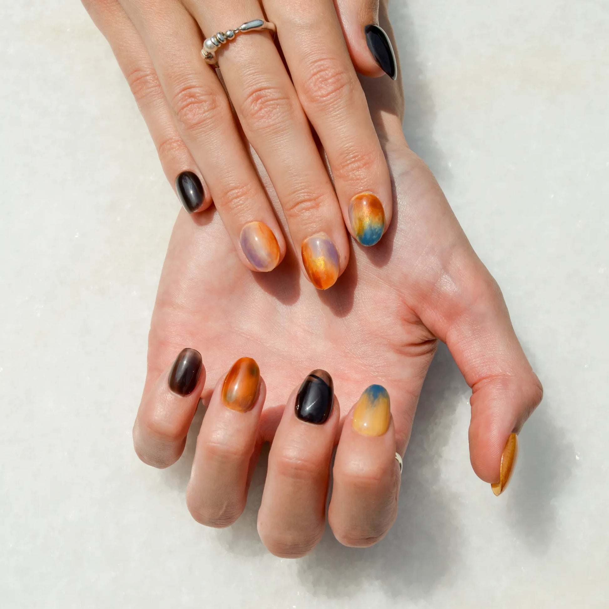 Faux ongles press-on faits main aux nuances intenses d’orange, beige, bleu et noir. Leur finition marbrée et lumineuse crée un effet unique, idéal pour une manucure sophistiquée et originale.
