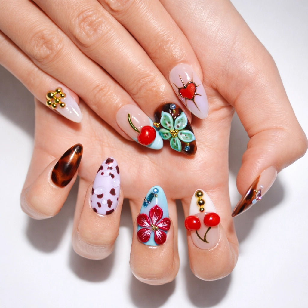 Le set Trip to Vegas est un mélange de nude et bleu ciel avec motifs écaille et léopard, décoré de cerises, fleurs 3D et cœur rouge.