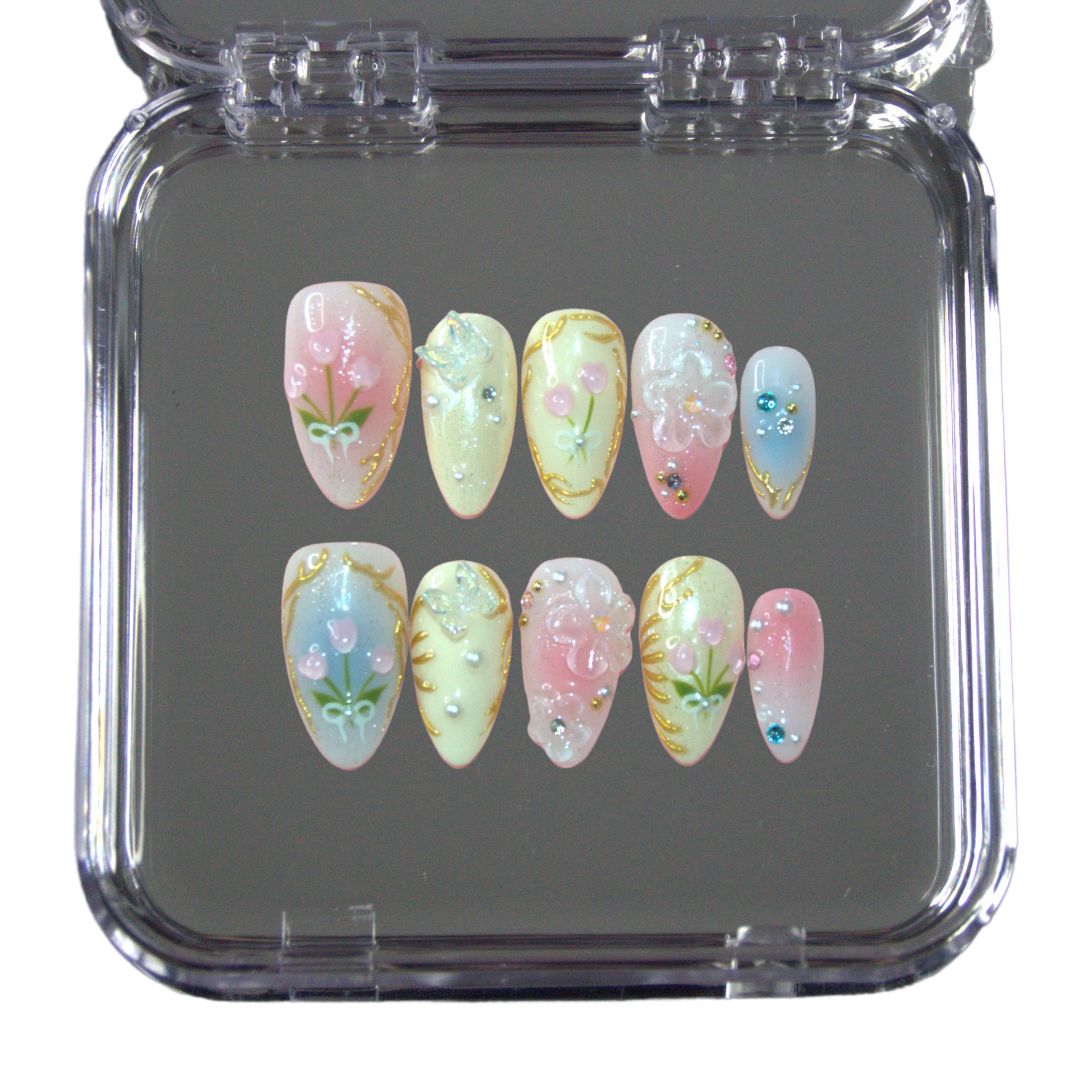 Faux ongles press-on faits main aux tons beige et rose, ornés de motifs floraux délicats et de détails 3D. Un design raffiné et romantique inspiré d’un jardin en fleurs.